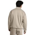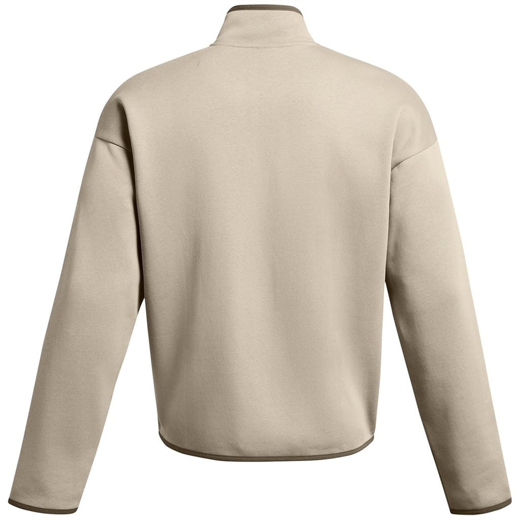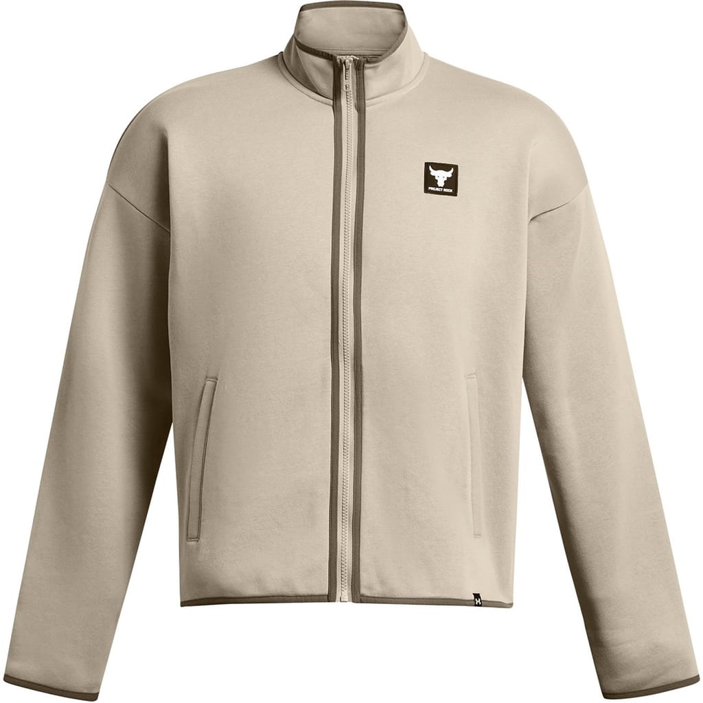 This Under Armour sweatshirt jacket features a hooded design with a high collar and a full zipper closure. The relaxed fit and drop shoulder sleeves offer comfort, while the ribbed cuffs and straight hem provide a neat finish. The solid pattern is complemented by a logo patch, adding a touch of brand identity. -