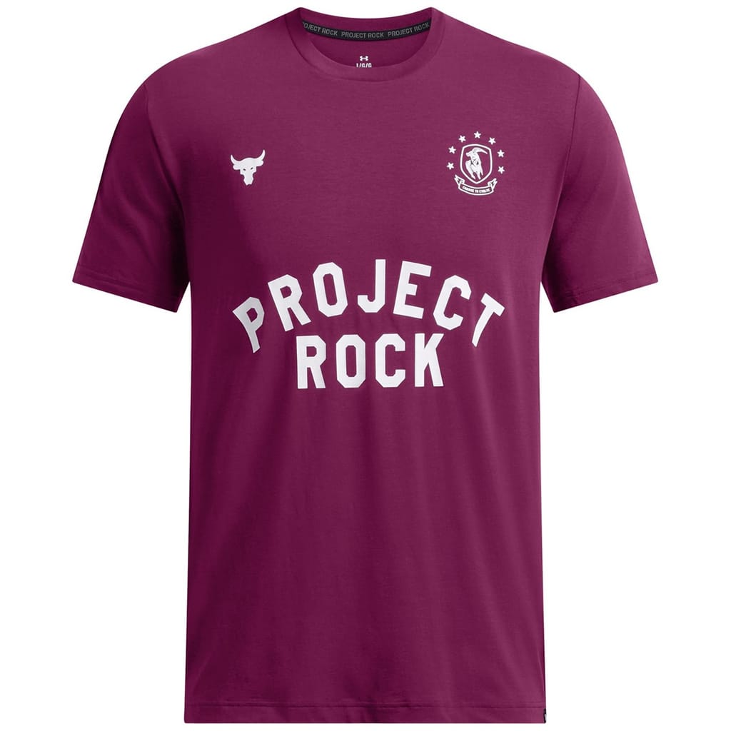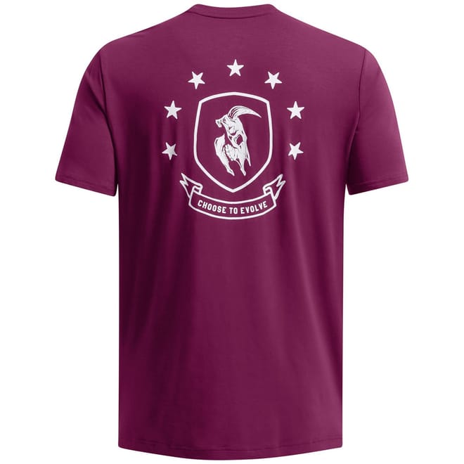 This Under Armour top is perfect for casual wear, featuring a regular fit and short sleeves. The crew neck design is complemented by a striking graphic print, including a large genie and text graphic. The top is adorned with a logo, adding a distinctive touch to its overall look. -