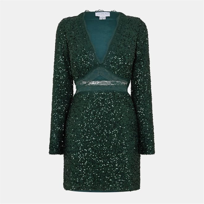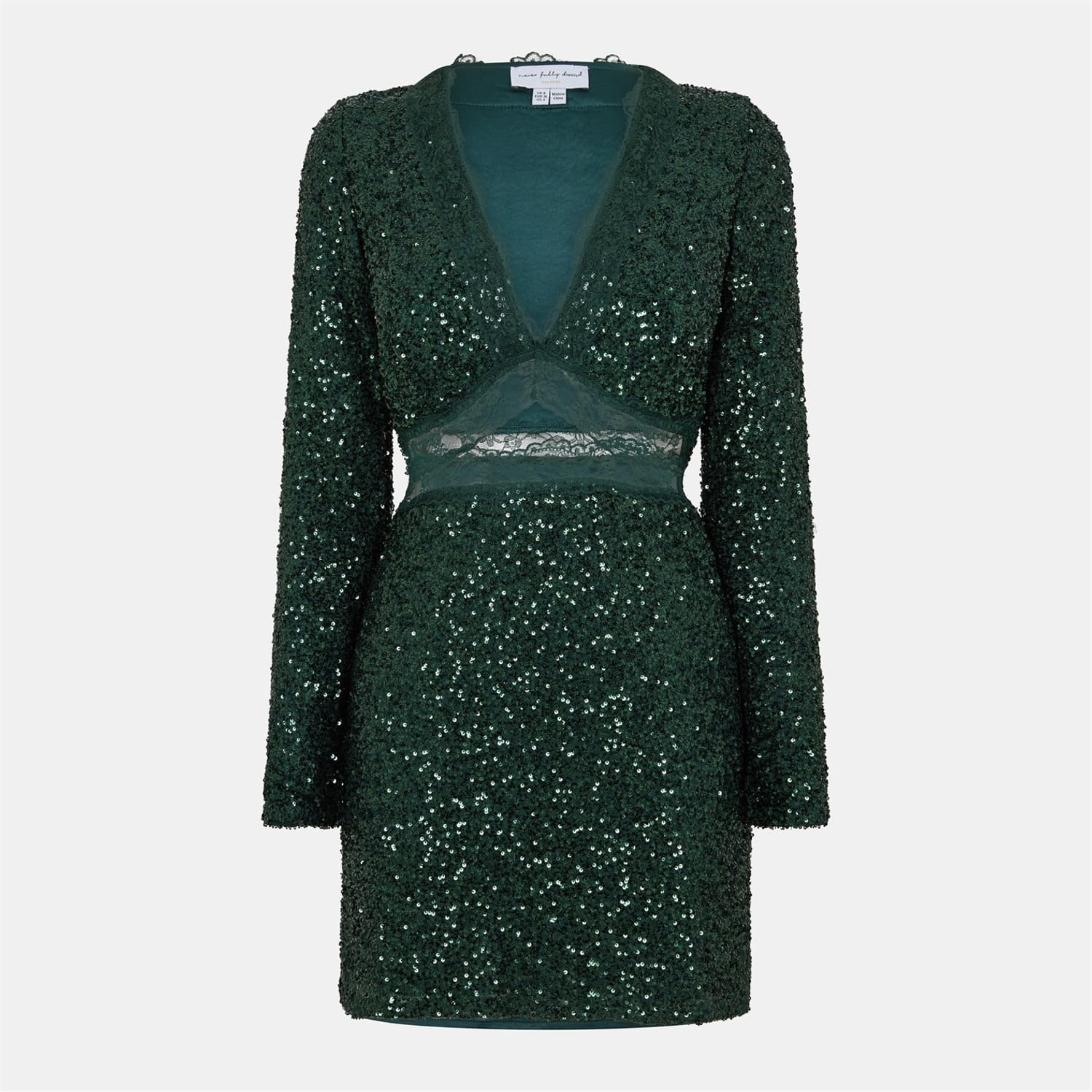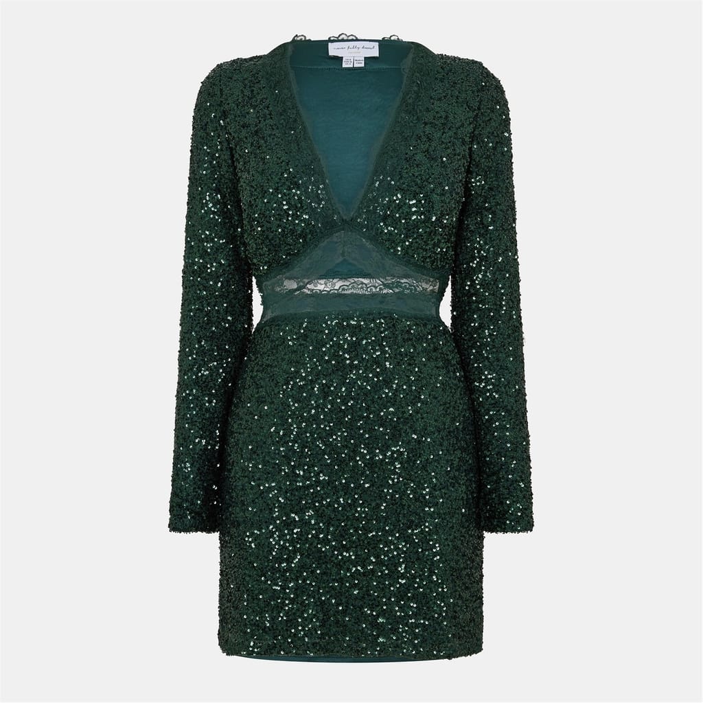 This Never Fully Dressed mini sheath dress features a sophisticated v-neck and a straight hem. The regular fit is enhanced by sequin embellishments and a stylish cut-out detail. The solid, textured pattern adds a touch of elegance, making it a versatile choice for various occasions. -