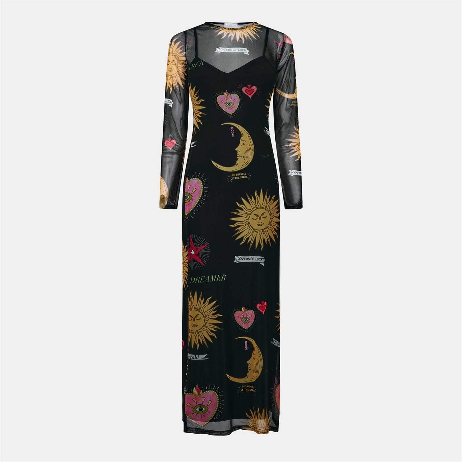 This Never Fully Dressed sheath dress is a striking maxi piece featuring a crew neck and long sleeves. The dress showcases a graphic print with mesh details, adding a unique touch to its design. The regular fit ensures comfort, while the straight hemline provides a clean finish. Perfect for those seeking a blend of style and sophistication. -