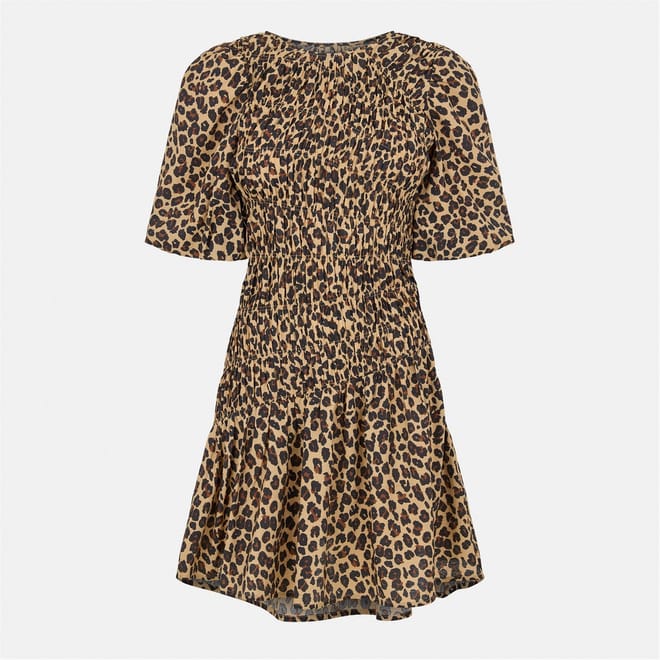 The Never Fully Dressed Leo mini dress is a stylish A-line piece featuring a bold leopard pattern. It has a crew neck and puff sleeves, complemented by a straight hem. This dress combines contemporary design with a classic silhouette, making it a standout choice for any occasion. -