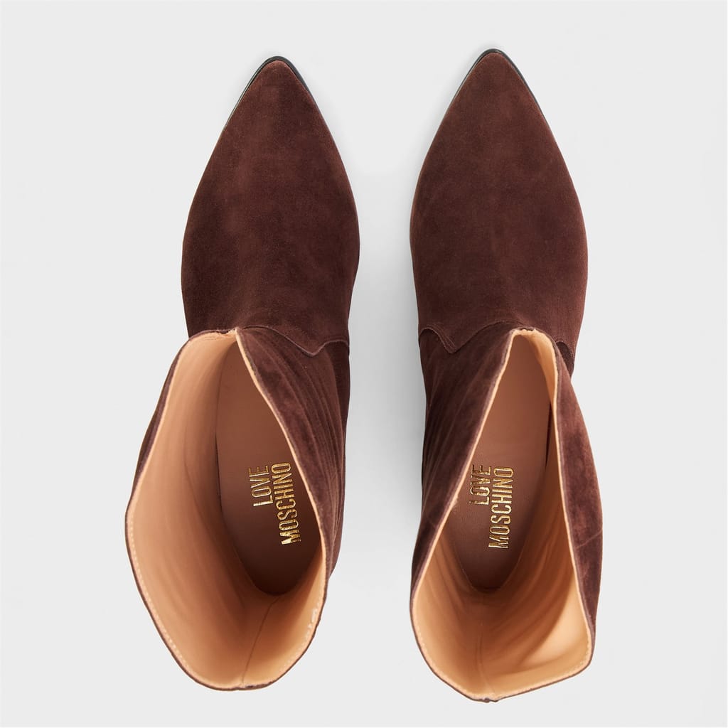 Step into style with Love Moschino's western boots, a perfect blend of fashion and function. These boots feature an almond toe design, offering a sleek and modern silhouette. Crafted for those who appreciate unique footwear, they embody the distinctive charm of western boot styles, making them a standout addition to any shoe collection. -