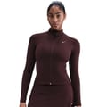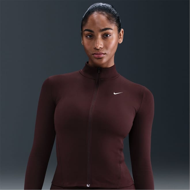 This Nike track jacket from the activewear collection features a full zipper closure and a zip neck. Designed with a slim fit, it has a short length and a curved hem. The solid pattern is complemented by a logo embellishment. Ribbed cuffs add a touch of style to this performance jacket, making it a versatile addition to your wardrobe. -