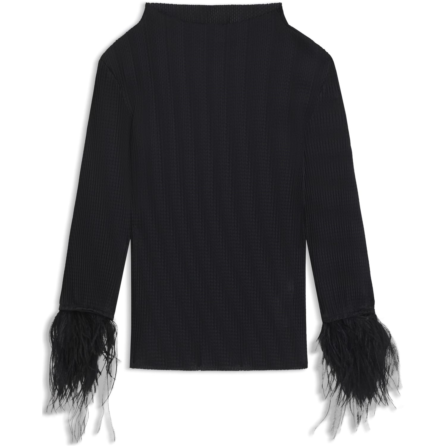 Make a statement with the BOSS Detachable Feather Cuff Jumper, featuring a stylish plissé texture and bold graphic jacquard design. The standout detachable feather cuffs, secured with discreet snap buttons, add a touch of drama and versatility. Perfect for chic evening events, fashion-forward gatherings, or sophisticated parties where you want to turn heads with effortless elegance.