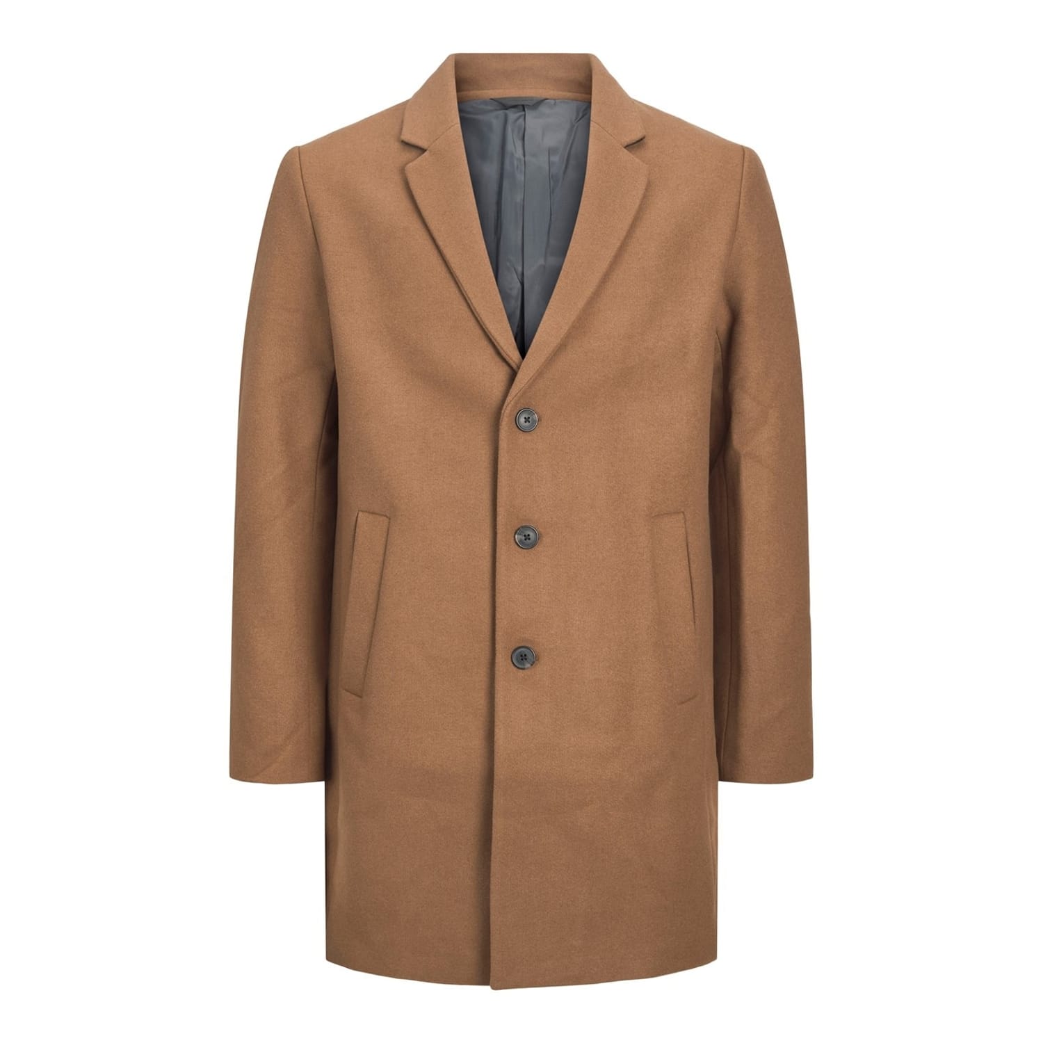 This Jack & Jones overcoat from the Classics collection is perfect for winter. Featuring a lapel collar and a button closure, it offers a regular fit with a straight hem. The solid pattern and pocket embellishments add to its formal appeal, making it a versatile addition to your wardrobe. -