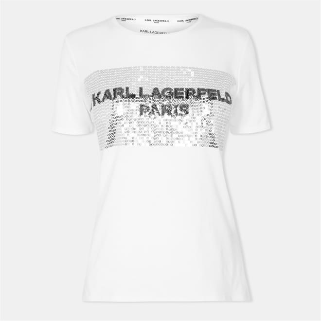 This Karl Lagerfeld top features a regular fit with a crew neck and short sleeves. The design is enhanced by sequin embellishments and lettered branding, showcasing a stylish logo print. The slip-on style ensures ease of wear, making it a versatile addition to any wardrobe. -