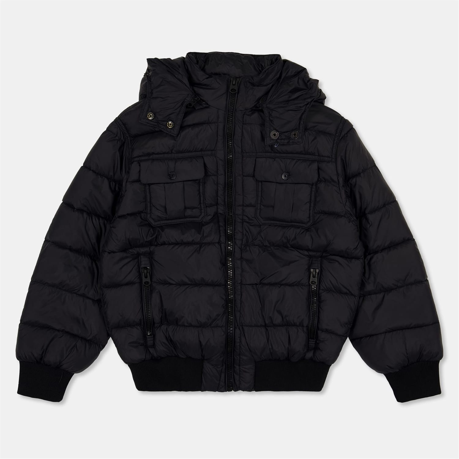 This G-Star puffer jacket features a hooded neckline and a regular fit, offering both style and comfort. The jacket is adorned with a logo and includes practical elements such as zipped and chest pockets. It has a ribbed hem and cuffs, providing a snug fit. The solid pattern and short length make it a versatile addition to your wardrobe, perfect for cooler seasons. -