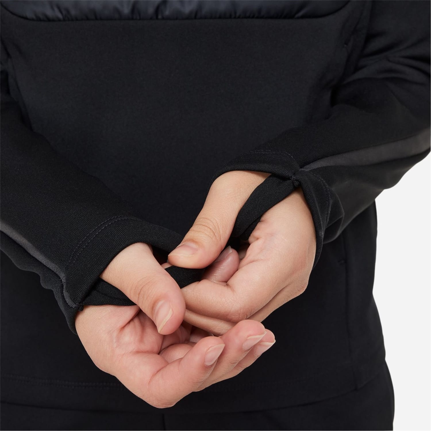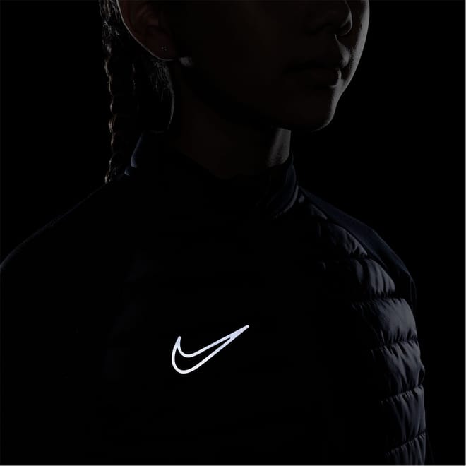 This Nike track jacket features a zip neck and a band collar, offering a sleek and sporty look. The raglan sleeves with thumbhole cuffs provide comfort and flexibility, while the straight hem and regular fit ensure a classic silhouette. The solid pattern and logo embellishment add a touch of style, making it a versatile addition to your wardrobe. -