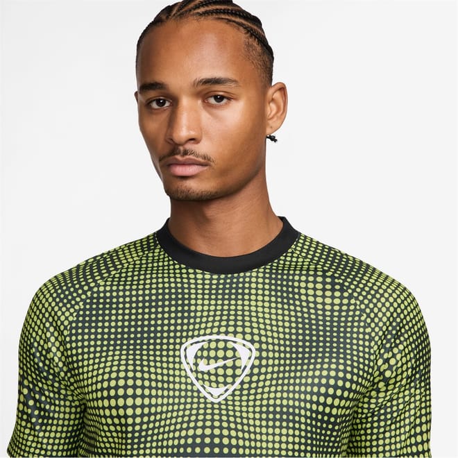 This Nike top is designed for performance and casual wear. It features a crew neck and raglan short sleeves for a comfortable fit. The regular fit ensures ease of movement, while the ribbed collar adds a touch of style. The polka dot pattern is complemented by a logo embellishment, making it a versatile addition to your wardrobe. -