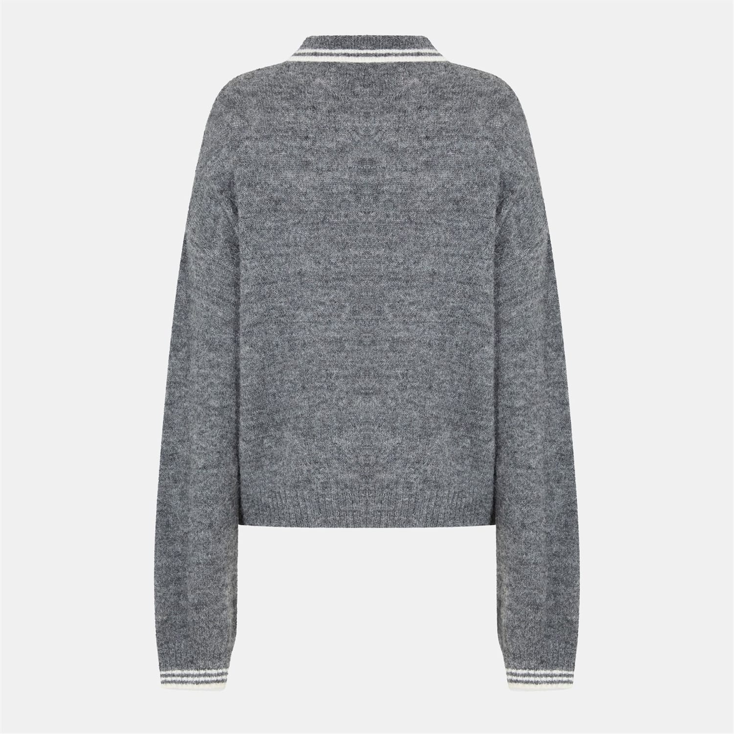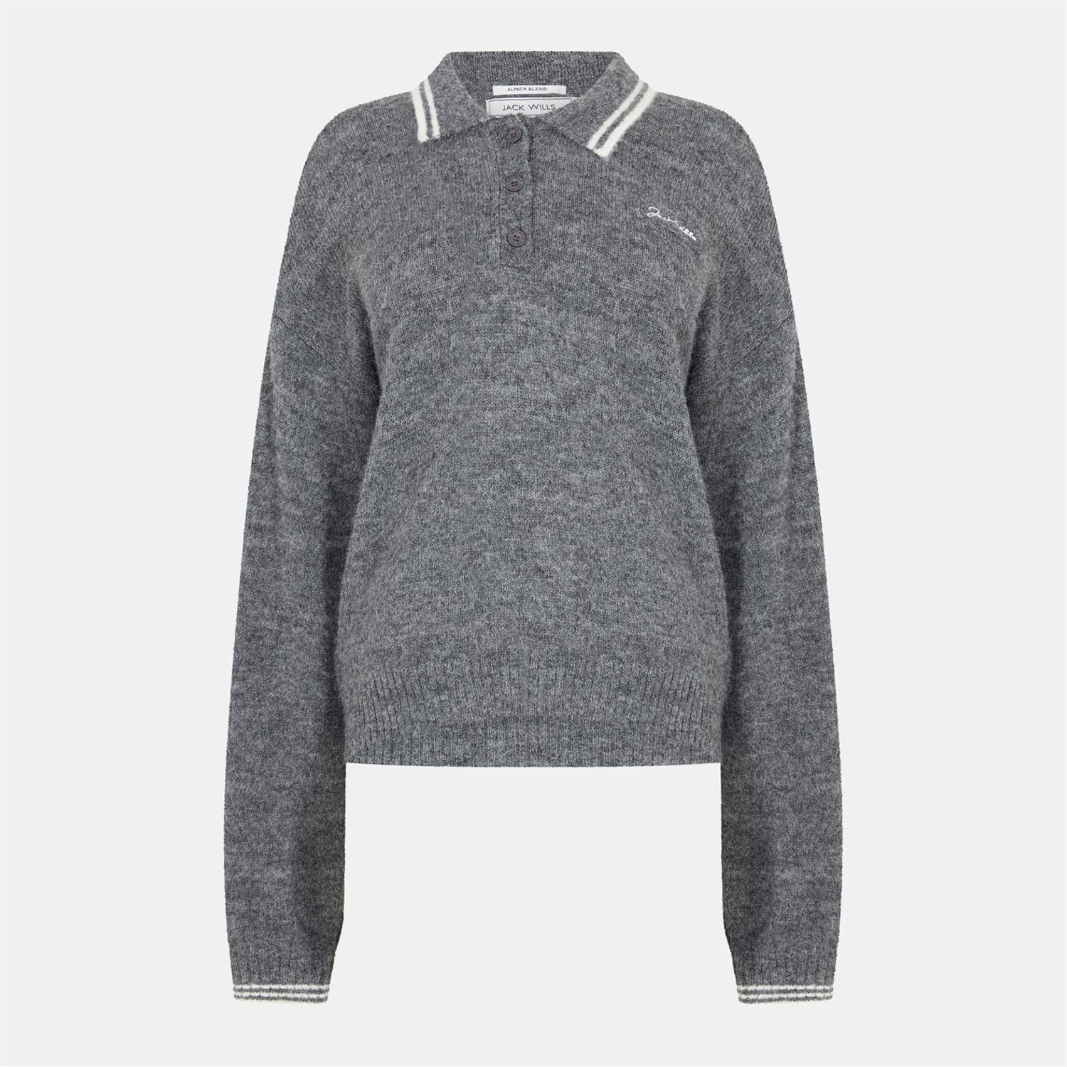 This Jack Wills top features a solid pattern with a polo collar and long sleeves. Crafted from knit material, it offers a regular fit and includes a front button closure. The design is enhanced with a button placket and embroidered details, while ribbed cuffs add a touch of refinement. -