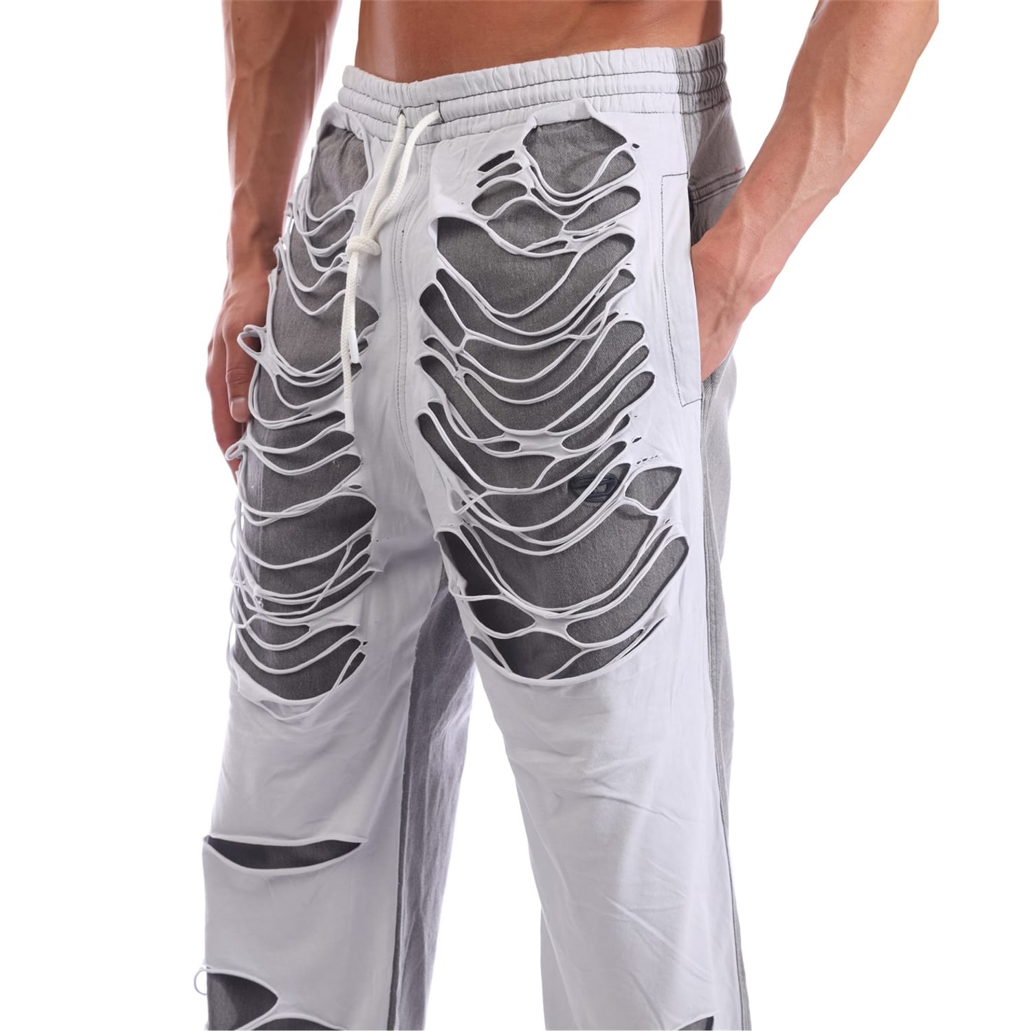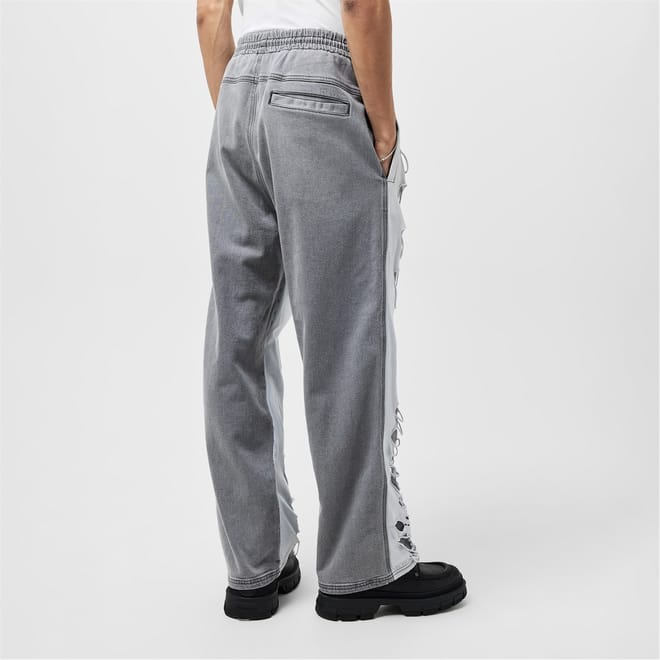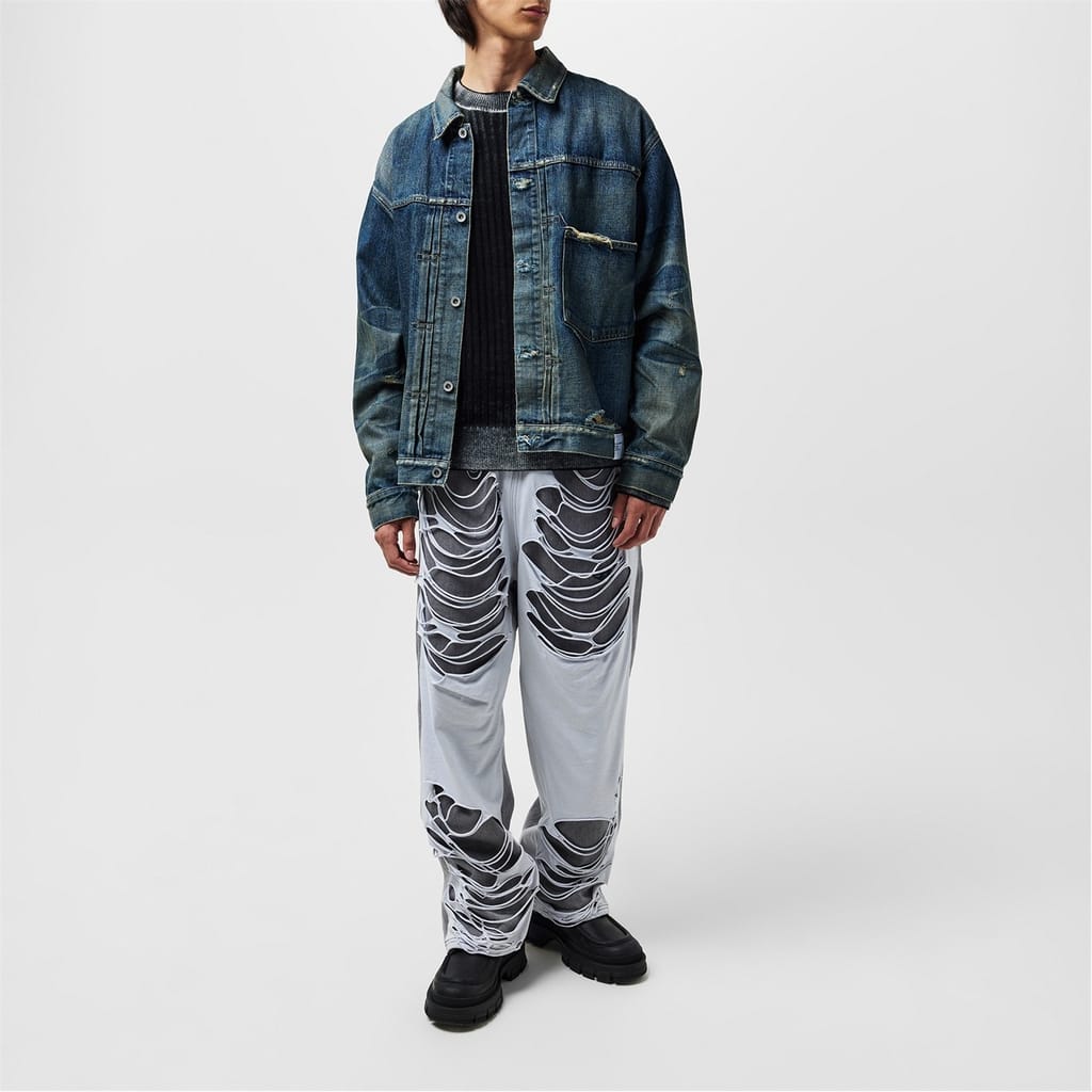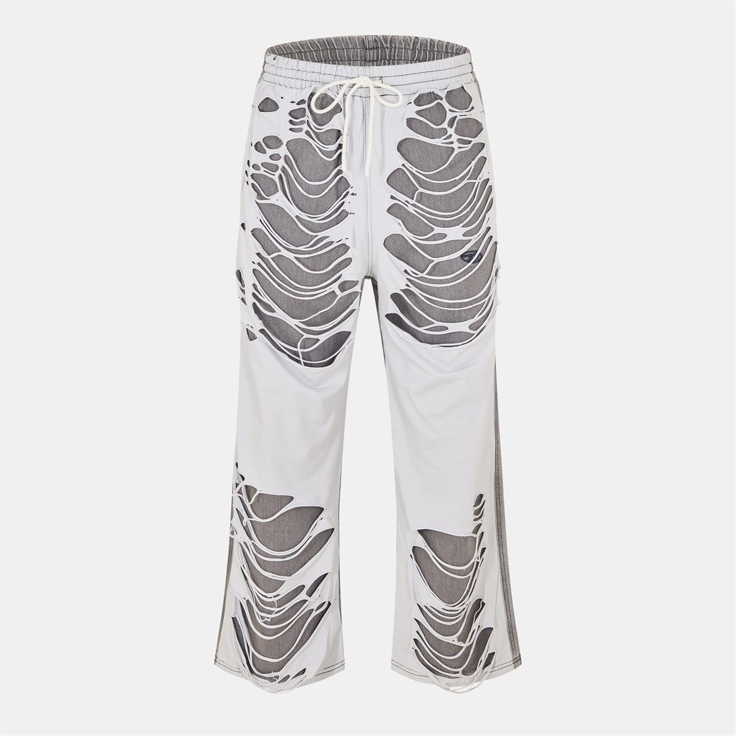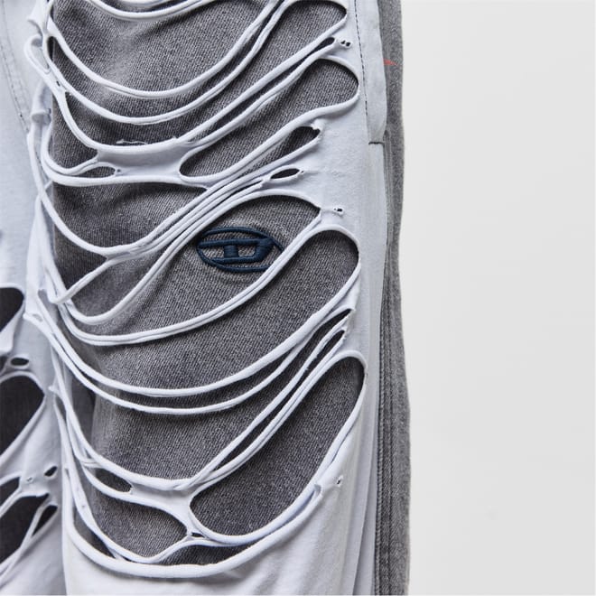Diesel's distressed wide-leg jeans feature an abstract pattern, offering a unique style. The design includes a drawstring and elasticated waistband for a comfortable fit. Embellished with patch and welt pockets, these jeans provide both functionality and a modern aesthetic. -
