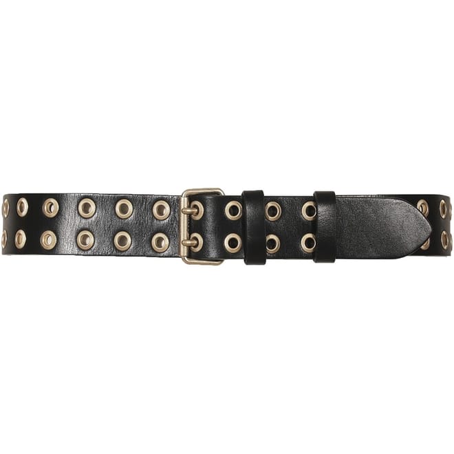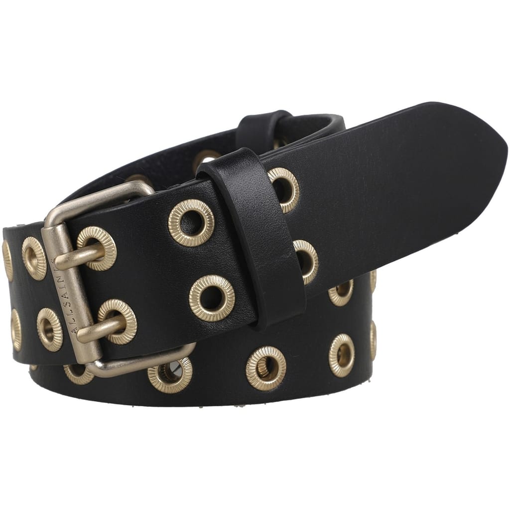 Elevate your casual wardrobe with the AllSaints leather belt. This stylish accessory features a pin buckle and adjustable length for a perfect fit. Embellished with eyelets and metal eyelets, it adds a touch of edge to any outfit. Crafted for versatility, this belt seamlessly combines functionality with fashion-forward design. -