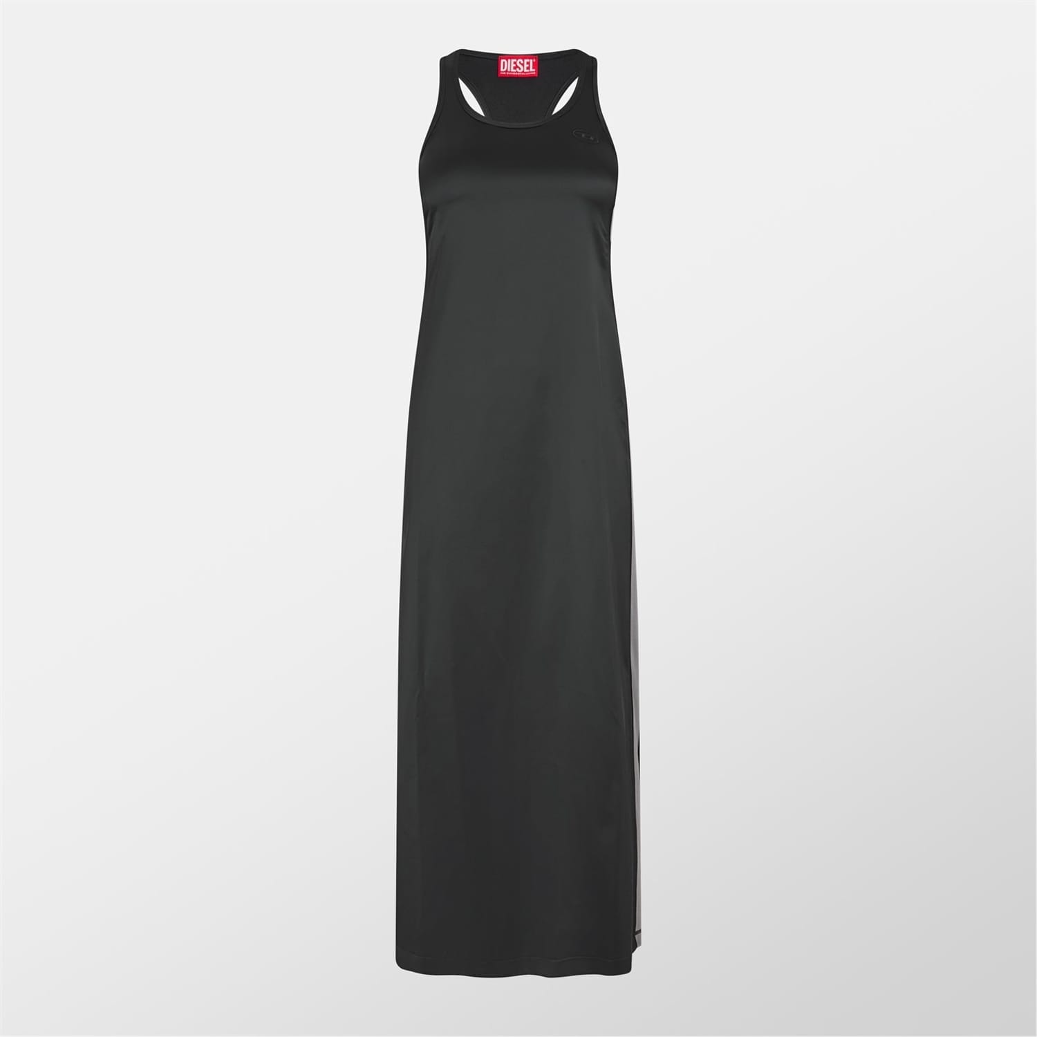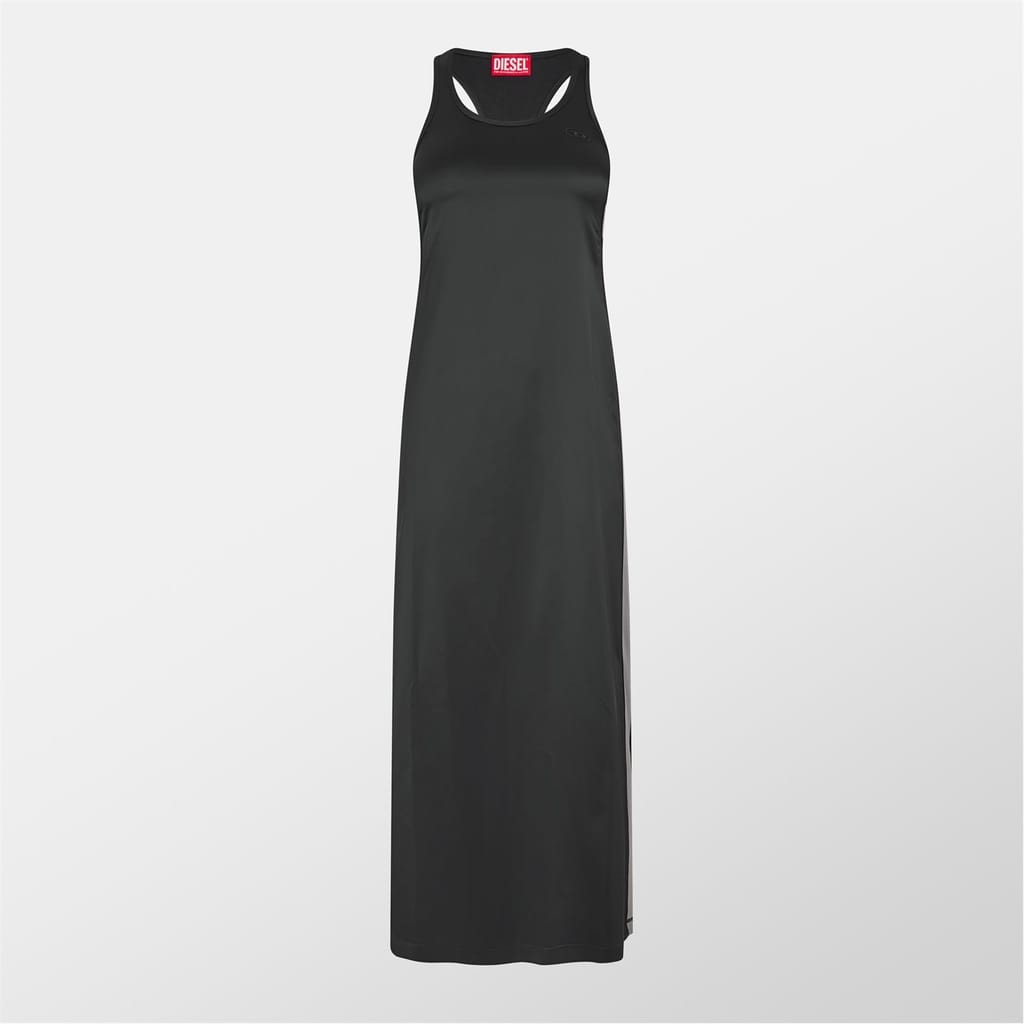 This Diesel maxi slip dress features a solid pattern and a straight hem, offering a sleek and modern look. The slim fit design is accentuated by the iconic logo embellishment, making it a stylish choice for any occasion. -