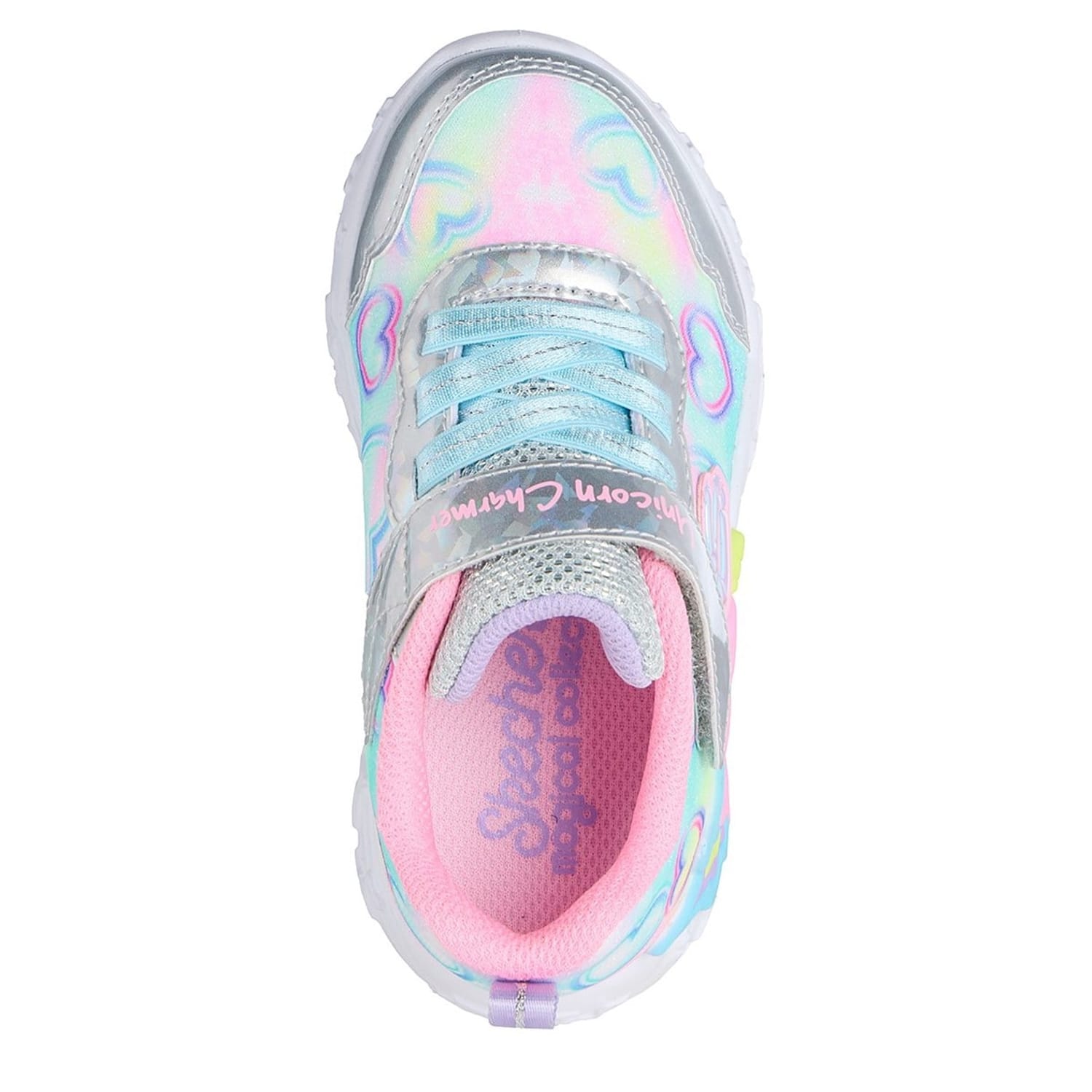 Step into a world of magic with Skechers unicorn trainers. These sneakers feature a playful hearts pattern and a unique light-up toe piece, adding a touch of fun to every step. Perfect for those who love a whimsical twist in their footwear, these shoes combine style and comfort effortlessly. -