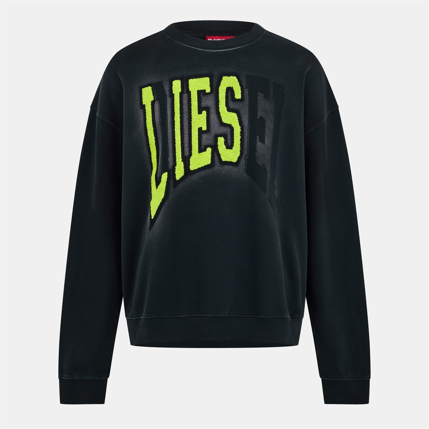 This Diesel top features a regular fit with a crew neck and long sleeves. The design is enhanced by a graphic print with embroidered logo lettering, adding a distinctive touch. Ribbed cuffs complete the look, ensuring comfort and style. -