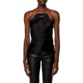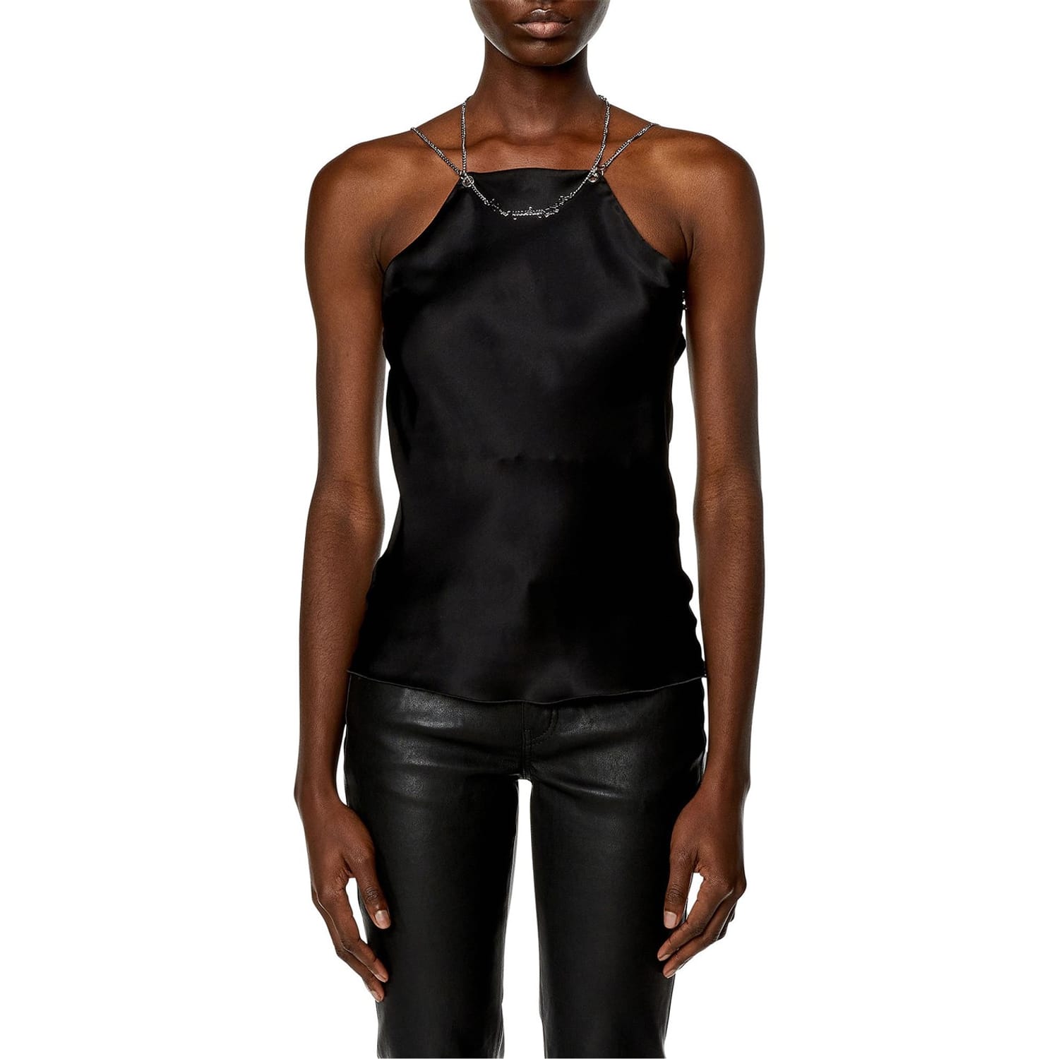 This Diesel top features a sleek sleeveless design with spaghetti straps, offering a slim fit. The solid pattern is elegantly enhanced by a chain embellishment, making it a stylish choice for any occasion. -