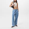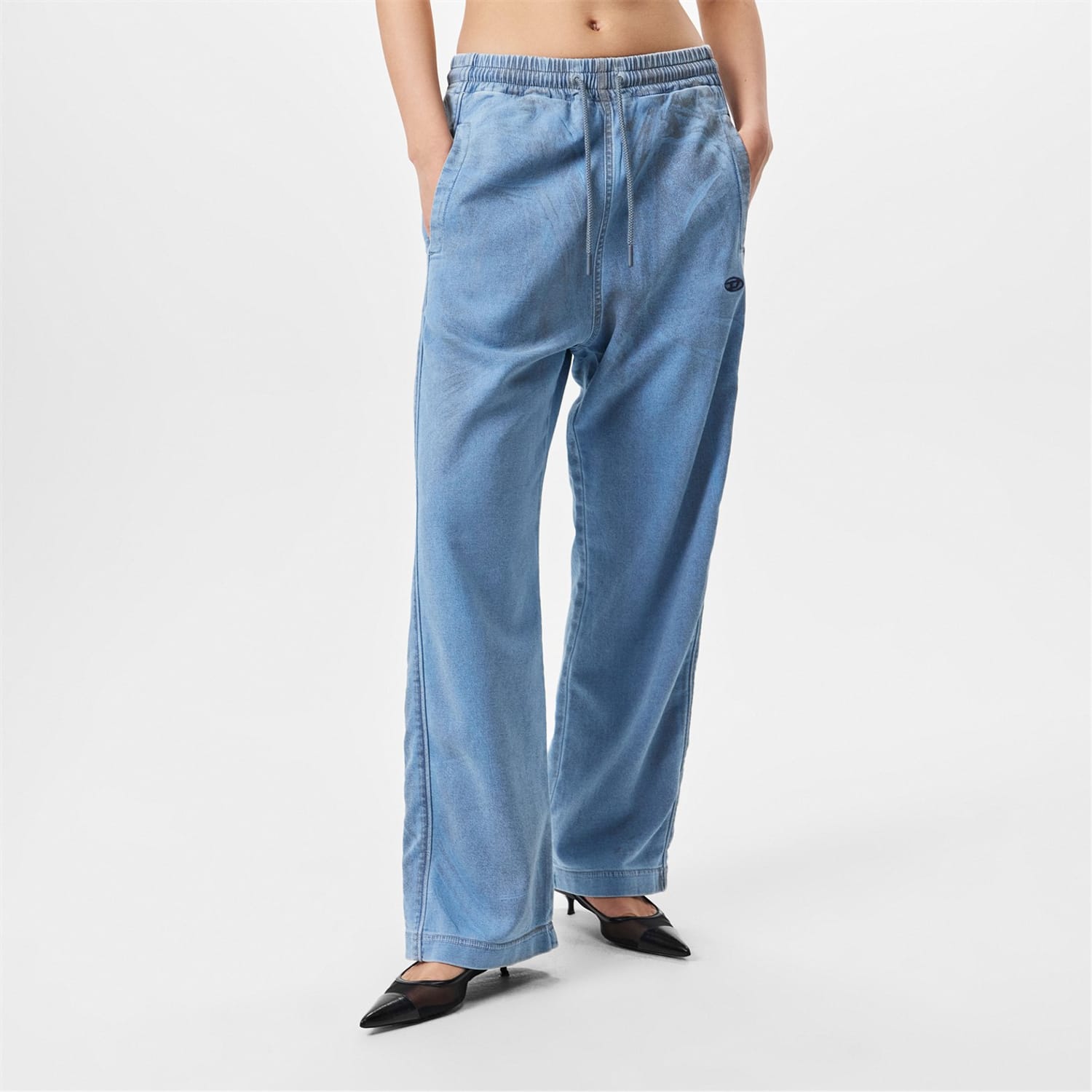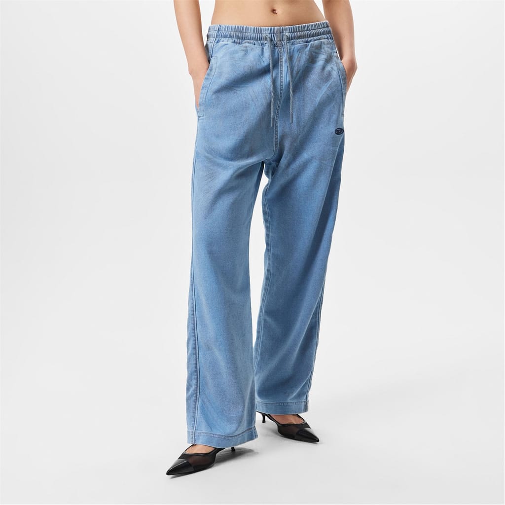Diesel wide leg jeans feature a drawstring and elasticated waistband for a comfortable fit. The washed pattern adds a stylish touch, while the wide fit and wide leg cut offer a relaxed silhouette. Embellished with front, welt, and pocket details, these jeans also showcase an embroidered logo for a distinctive finish. -