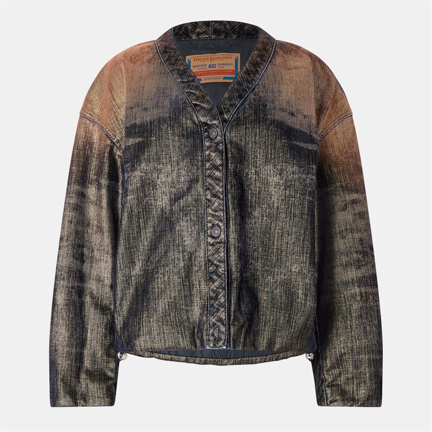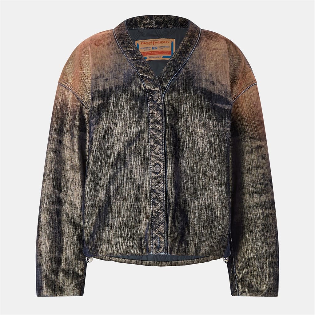 This Diesel denim jacket features a relaxed fit with a short length and a straight hem. The drop shoulder design adds a modern touch, while the button closure ensures a classic look. The textured pattern is complemented by a subtle logo embellishment, making it a stylish addition to any wardrobe. -