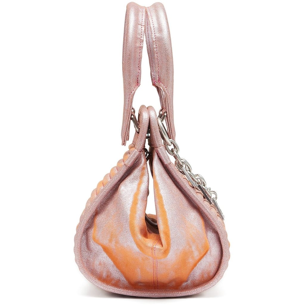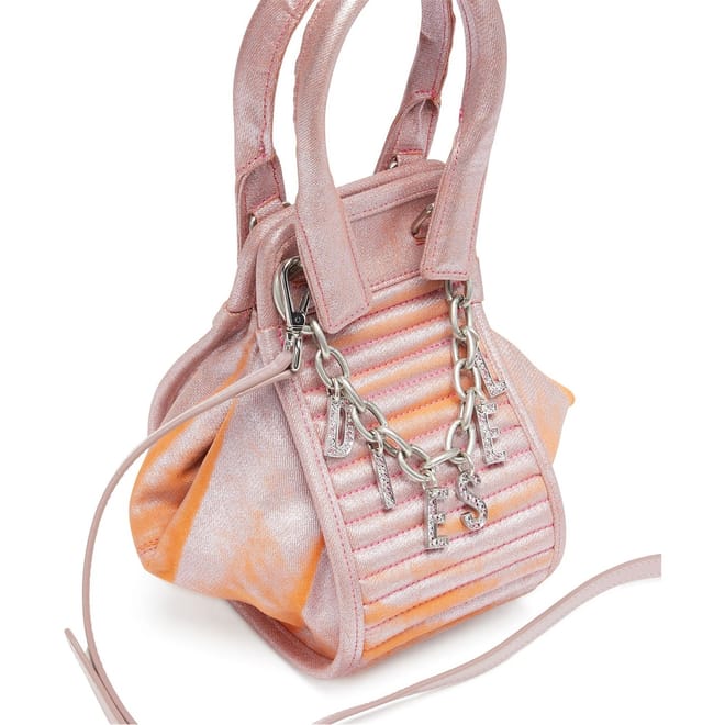 This Diesel mini bag is a stylish accessory featuring a shoulder handle for easy carrying. It is designed with a secure zipper closure and adorned with a chain embellishment. The bag also showcases a distinctive metal logo, adding a touch of brand identity to its sleek design. -
