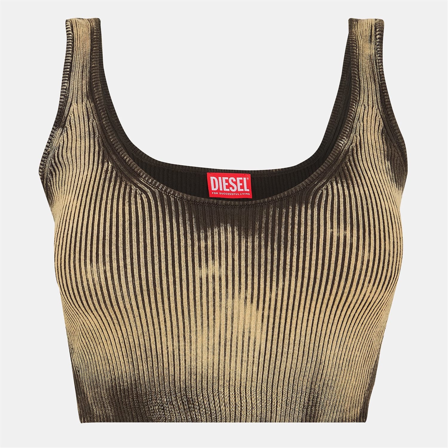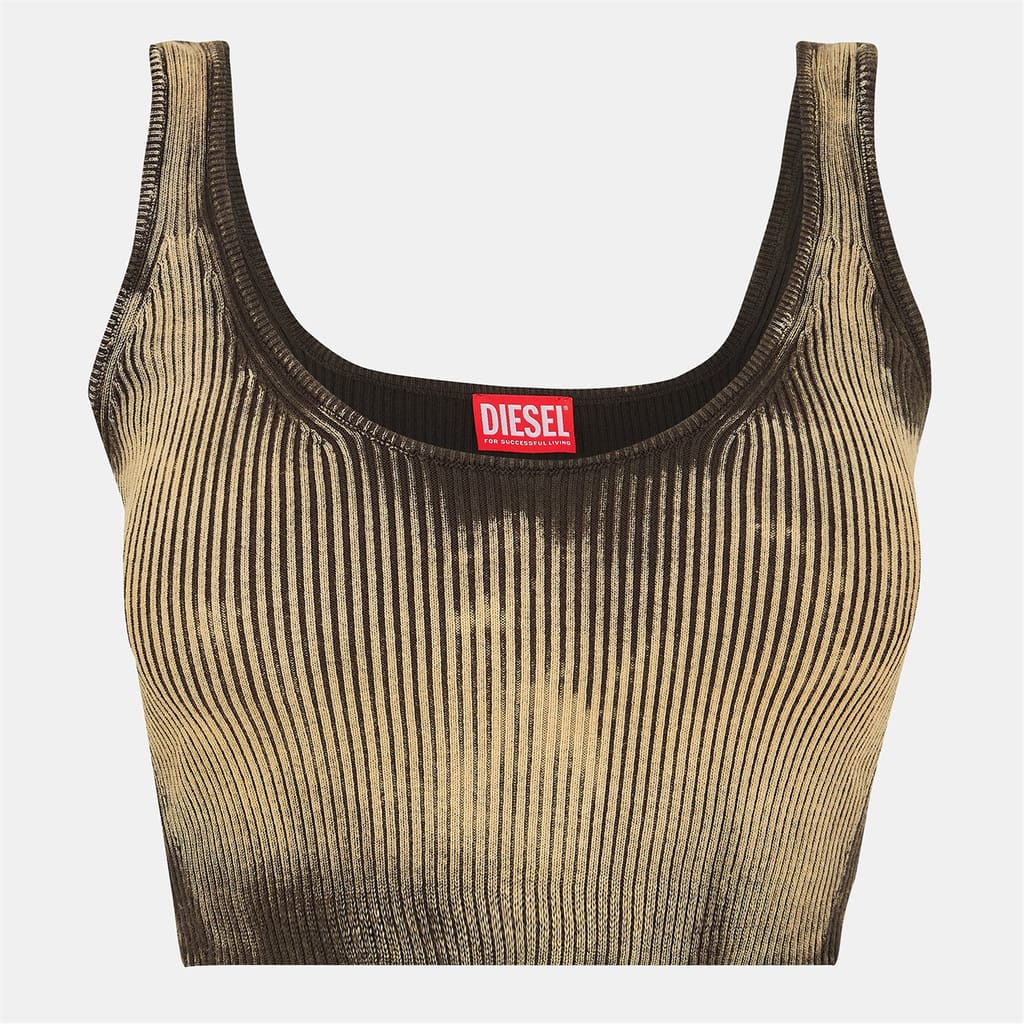 This Diesel top features a sleeveless design with a scoop neck and a slim fit, perfect for a modern look. The cropped length adds a trendy touch, while the ribbed pattern and knit fabric offer texture and comfort. Lined for added quality, it showcases a logo embellishment and lettering graphic, making it a stylish addition to any wardrobe. -