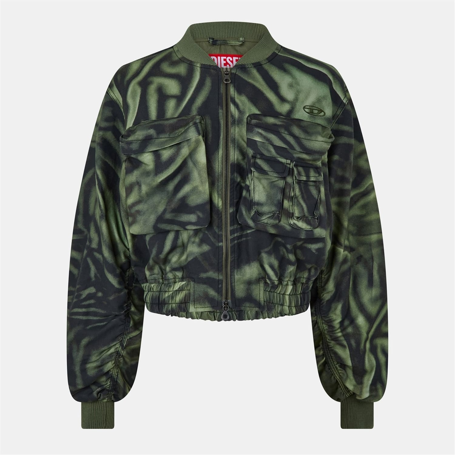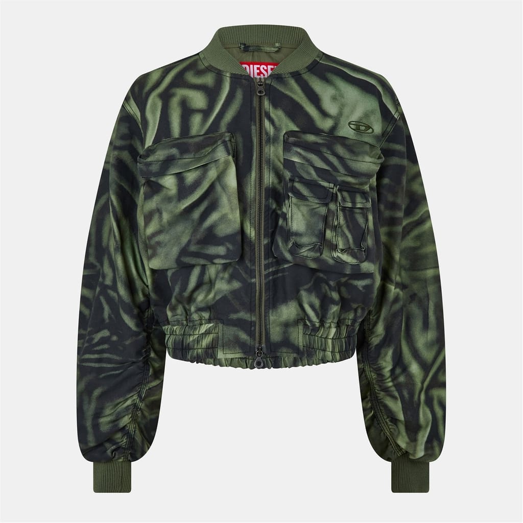 This Diesel top features a relaxed fit with a distinctive camo pattern. It includes a crew neck and long sleeves with ribbed cuffs. The bomber collar adds a stylish touch, while the zipper closure and pocket embellishment enhance functionality. -