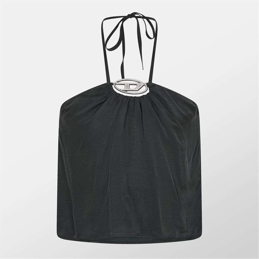 This Diesel top features a halter neckline and a sleeveless design, offering a relaxed fit for comfort. The solid pattern is complemented by a subtle logo embellishment, adding a touch of brand identity. The tie closure provides an adjustable fit, making it a versatile addition to your wardrobe. -