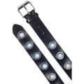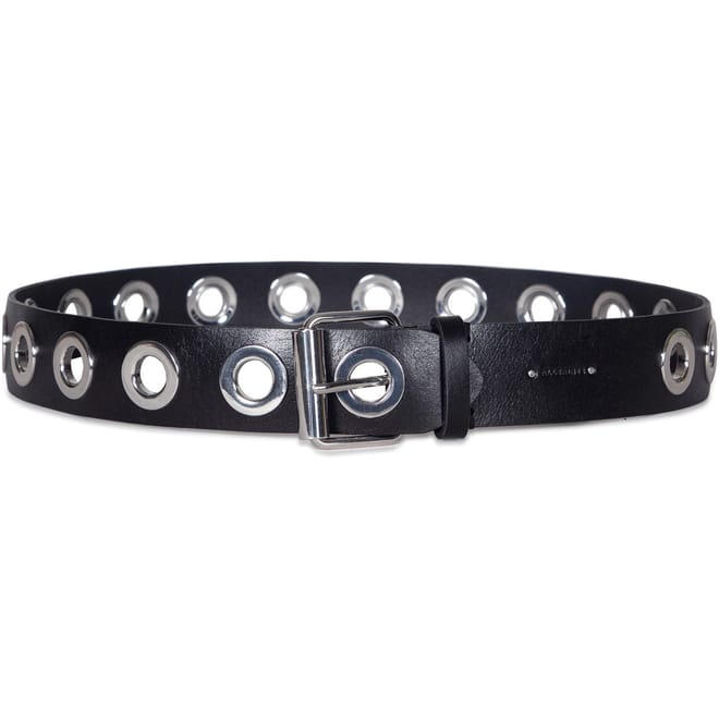 This AllSaints leather belt is a casual accessory featuring a pin buckle and adjustable length for a perfect fit. The design is enhanced with eyelet and metal eyelet embellishments, adding a distinctive touch to its style. Ideal for those seeking a blend of functionality and fashion in their everyday wear. -