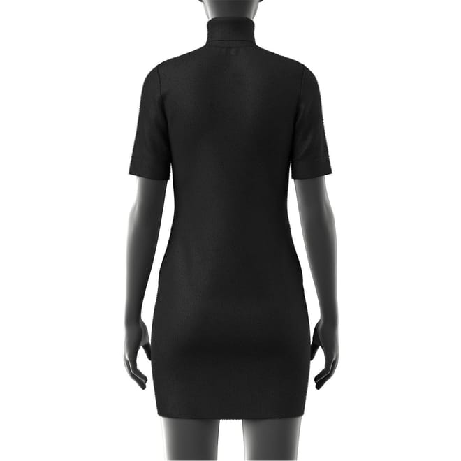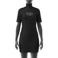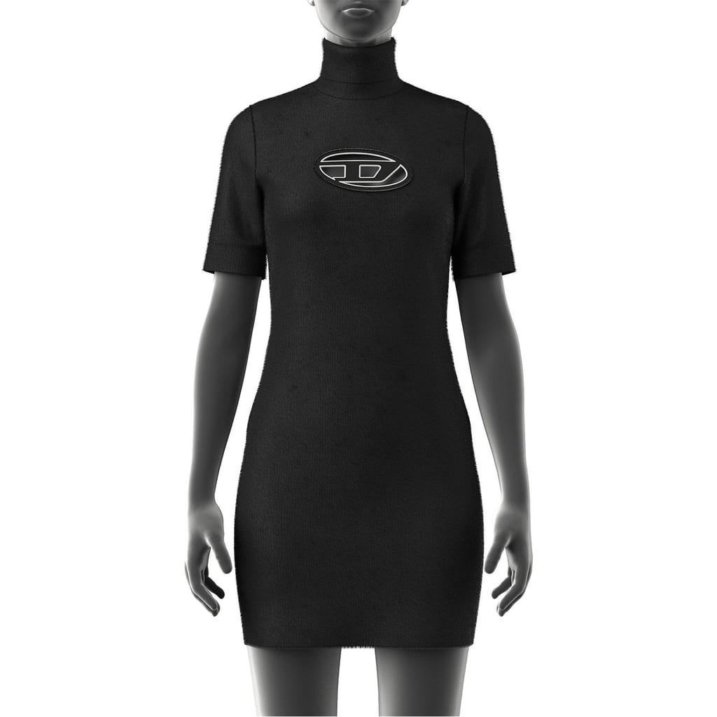 This Diesel mini bodycon dress features a turtle neck and short sleeves, crafted from a knit material for a slim fit. The solid pattern is complemented by a straight hem, while the design is enhanced with a logo patch embellishment. Lined for added comfort, this dress offers a sleek and modern look. -