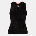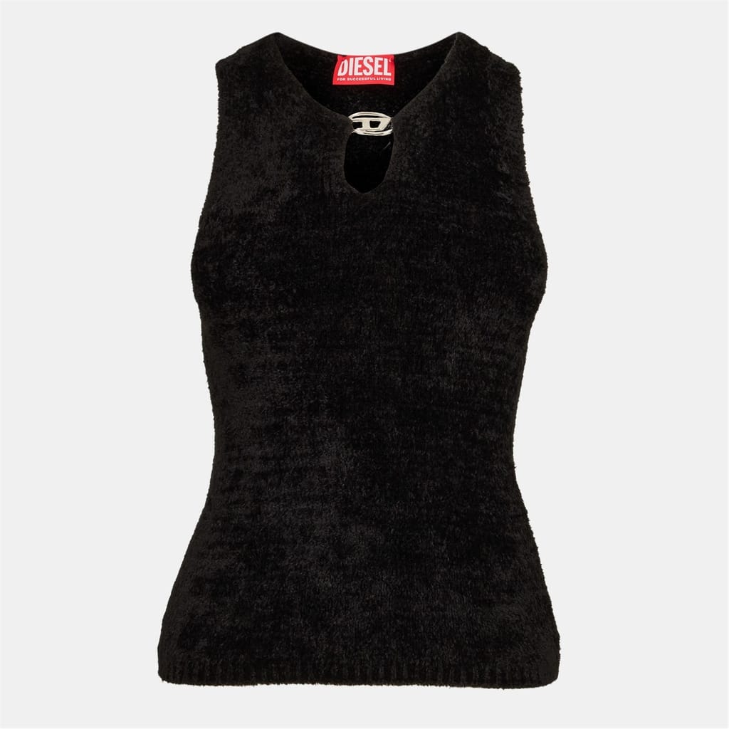 Discover Diesel's sleeveless top, featuring a keyhole neck and a slim fit. This solid knit piece is lined for added comfort and showcases a subtle logo embellishment. Perfect for those who appreciate minimalist design with a touch of brand identity. -