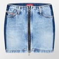 This Diesel mini skirt is a stylish addition to your casual collection. Featuring a regular fit and an A-line silhouette, it offers a comfortable yet chic look. The skirt is designed with a zipper closure and showcases a unique wash pattern. Embellished with a logo and pockets, it combines practicality with a touch of brand identity. -