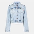 This Diesel denim jacket features a classic shirt collar and a button closure. Designed in a slim fit, it has a short length with a straight hem. The stone wash pattern adds a distinctive touch, while the logo and pocket embellishments enhance its style. -