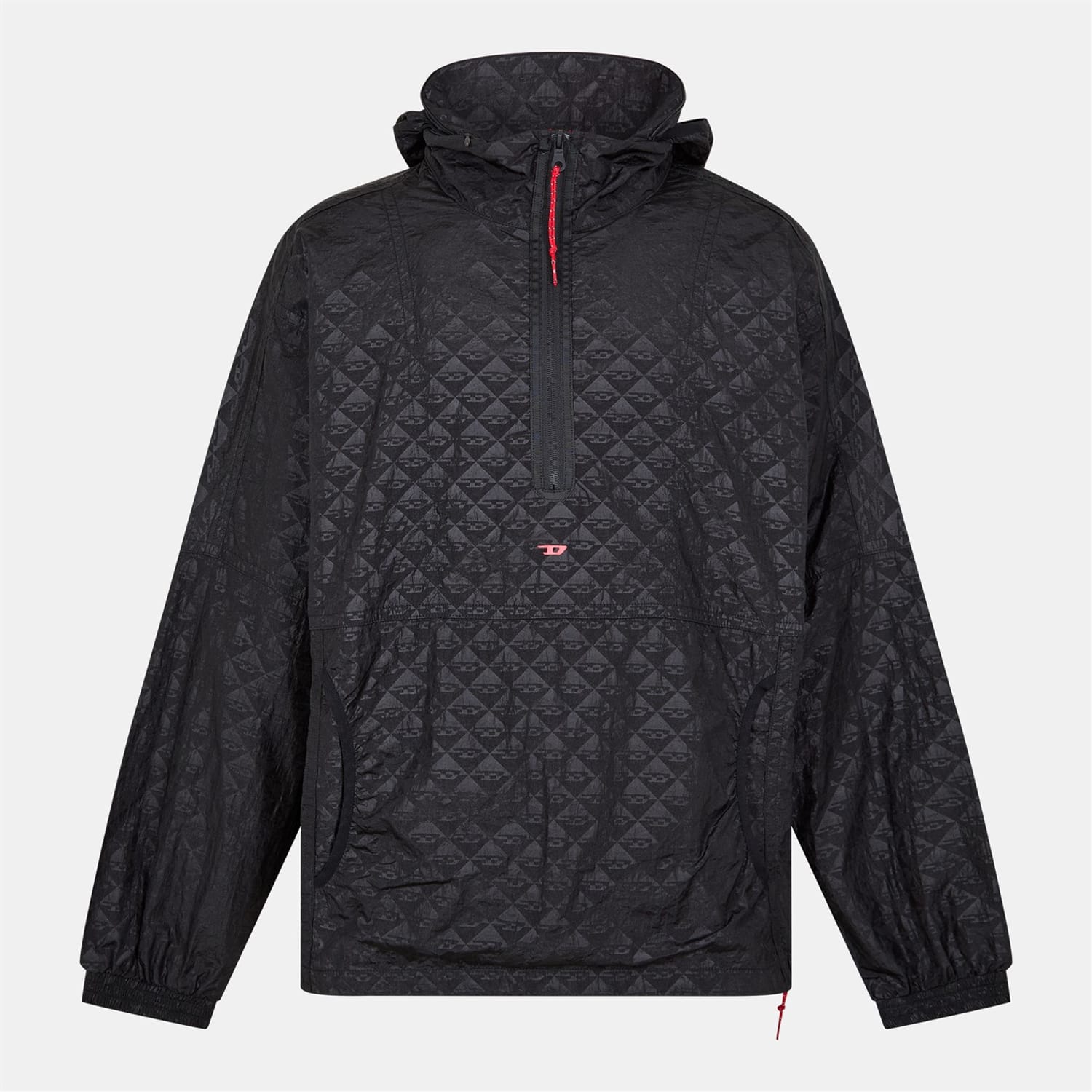 This Diesel bomber jacket features a short length and a relaxed fit, perfect for a casual look. The jacket is adorned with a geometric pattern and a logo embellishment, adding a touch of style. It includes a zipper closure and elasticated cuffs for comfort. The straight hem completes the design, making it a versatile addition to your wardrobe. -