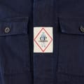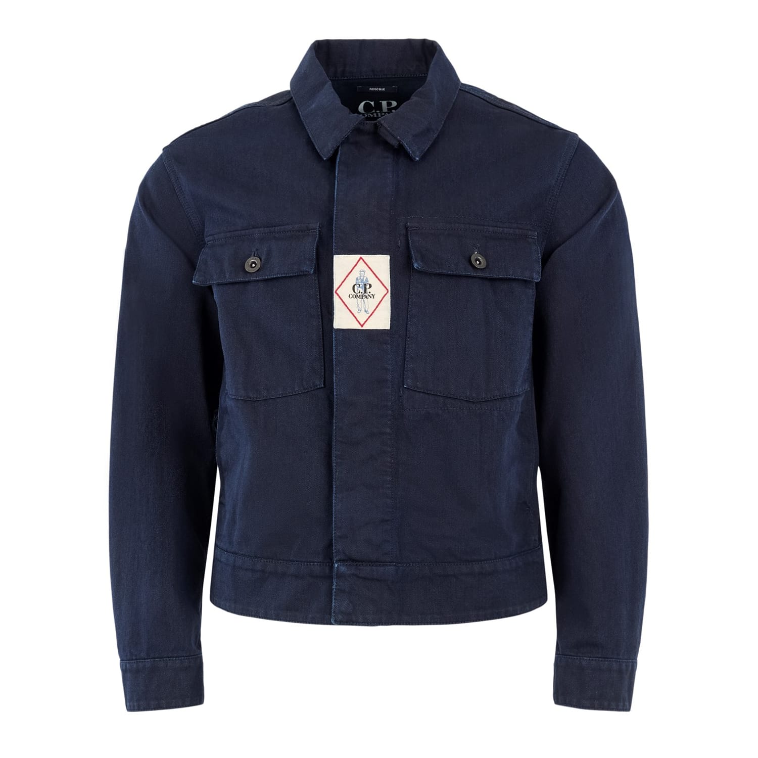This C.P. Company denim jacket features a classic shirt collar and a straight hem. Designed in a regular fit, it offers a solid pattern with a short length. The jacket is adorned with a logo patch and patch pockets, providing both style and functionality. It is secured with snap buttons for a sleek finish. -