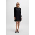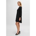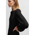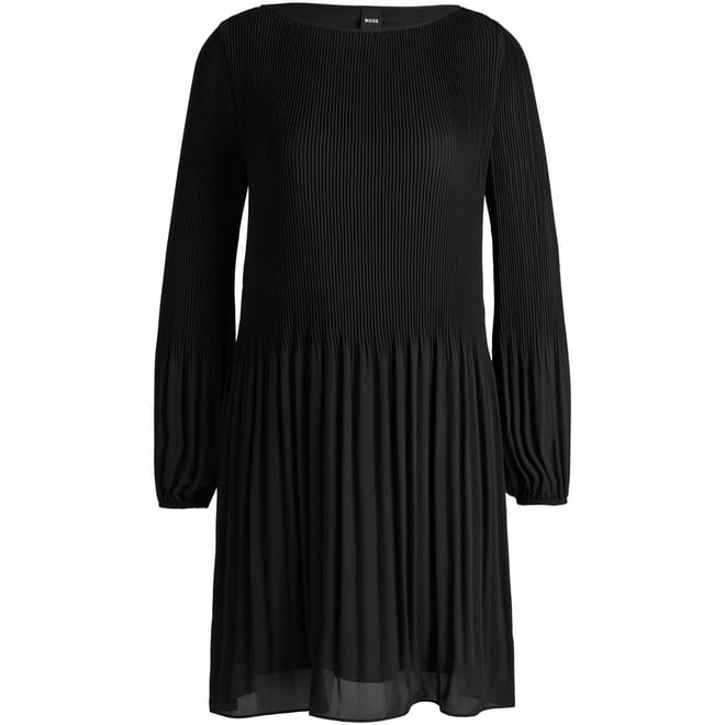This Boss skater dress features a mini length and a ribbed pattern, offering a stylish and contemporary look. The dress is designed with a boat neck and long balloon sleeves, adding a touch of elegance. The straight hemline completes the design, making it a versatile choice for various occasions. -