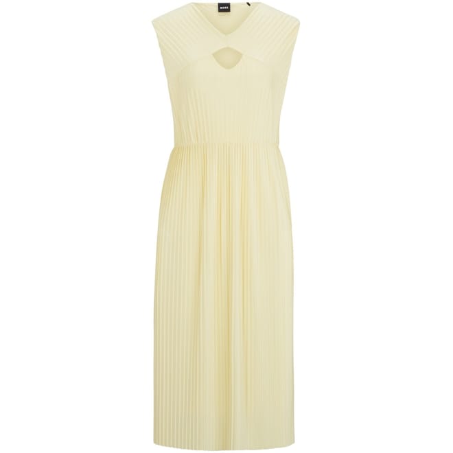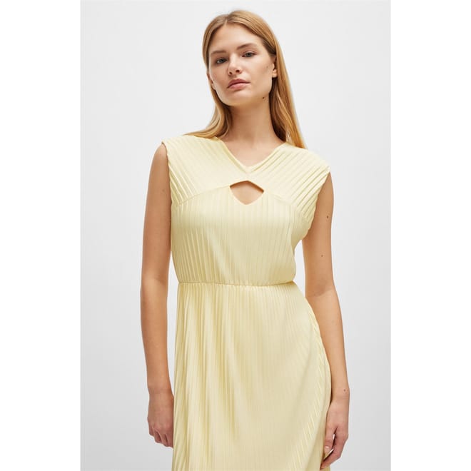 This Boss midi dress features a milkmaid style with an elegant A-line silhouette. The dress showcases a V-neckline and a straight hem, complemented by a ribbed pattern. A unique cut-out embellishment adds a touch of sophistication to this sleeveless design, making it a standout piece for any occasion. -