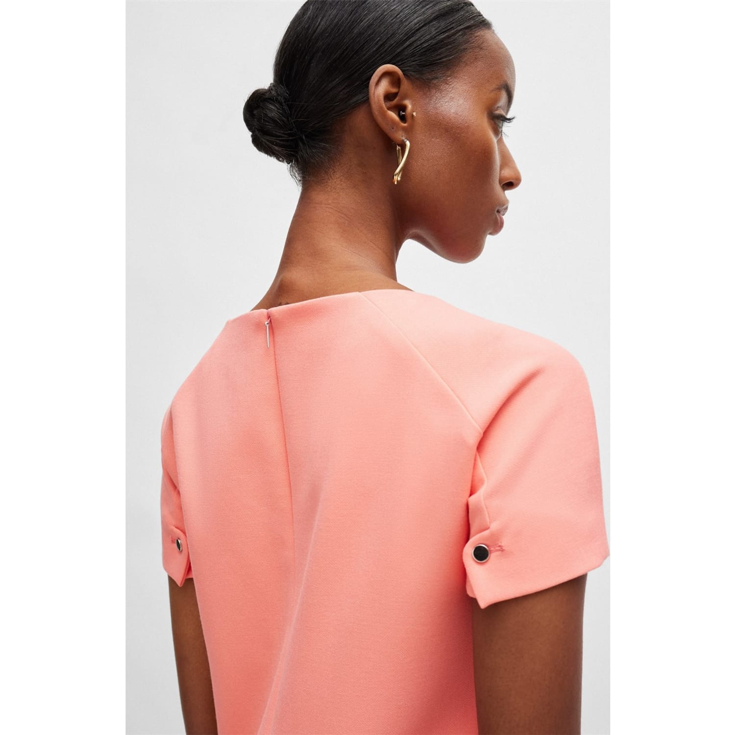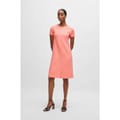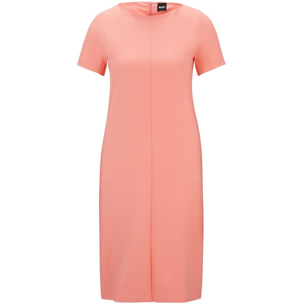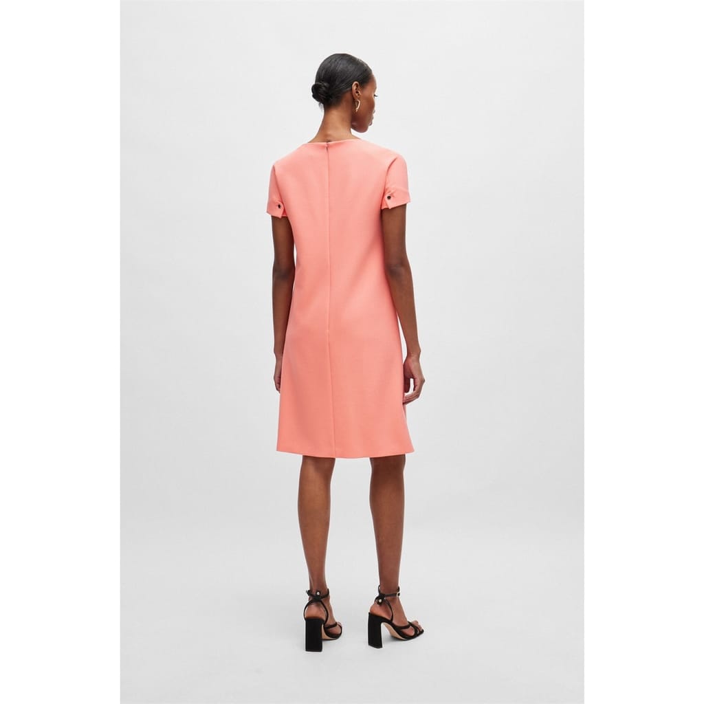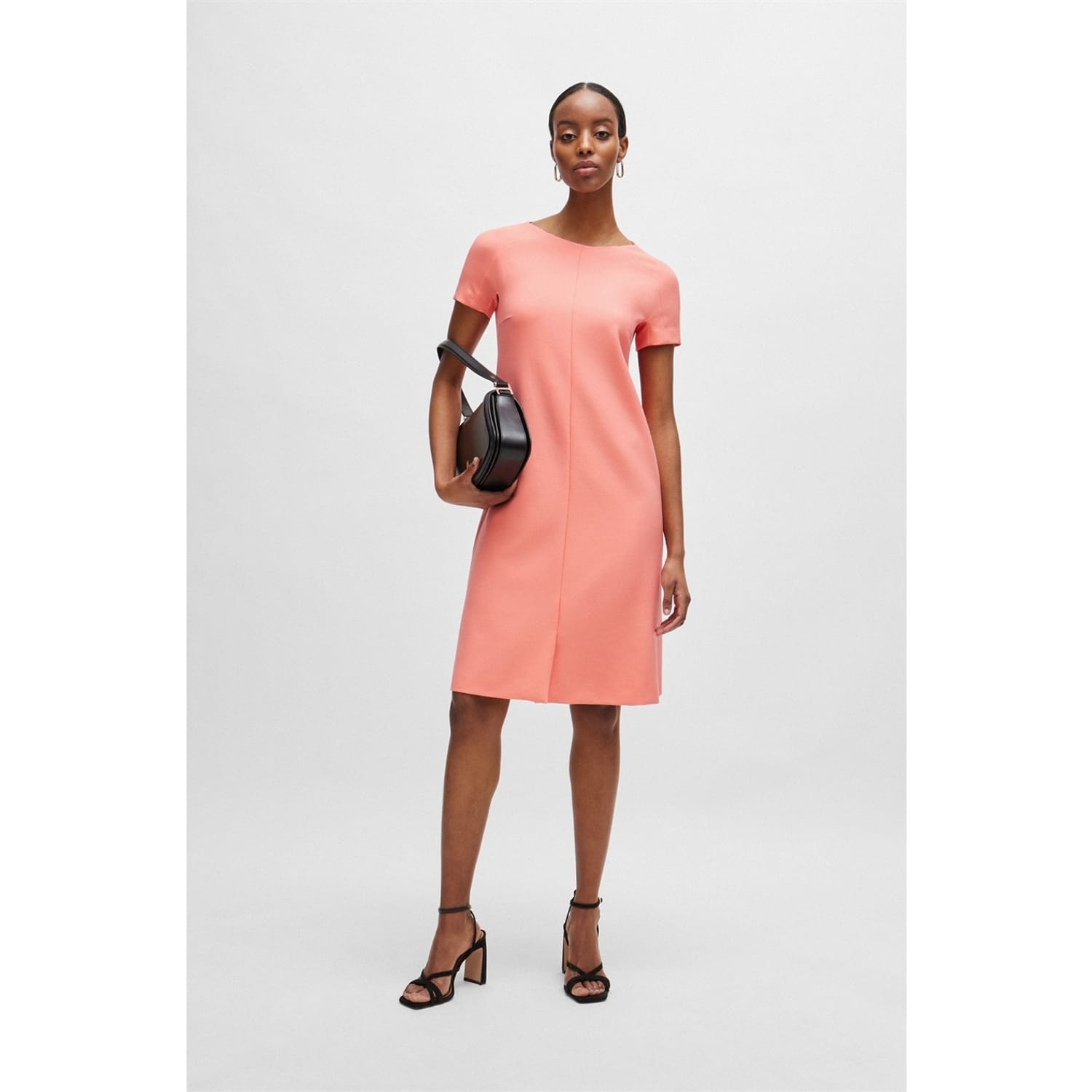 This Boss shift dress is a sophisticated choice for any occasion. Crafted with a knee-length design, it features a crew neck and short sleeves for a classic look. The solid pattern and regular fit ensure a timeless appeal, while the straight hem adds a touch of elegance. -