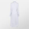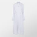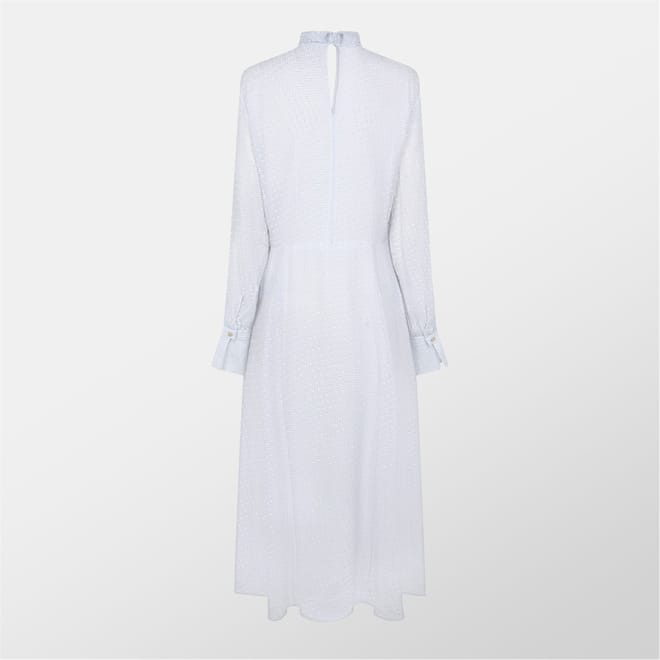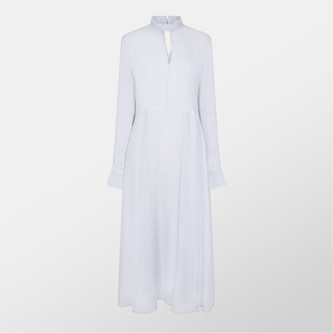 This Boss maxi dress features a high collar and a high neckline, offering a sophisticated look. The long sleeves complement the textured pattern, while the curved hemline adds a touch of elegance. Designed in an A-line style, this dress is perfect for those seeking a refined and stylish option for various occasions. -