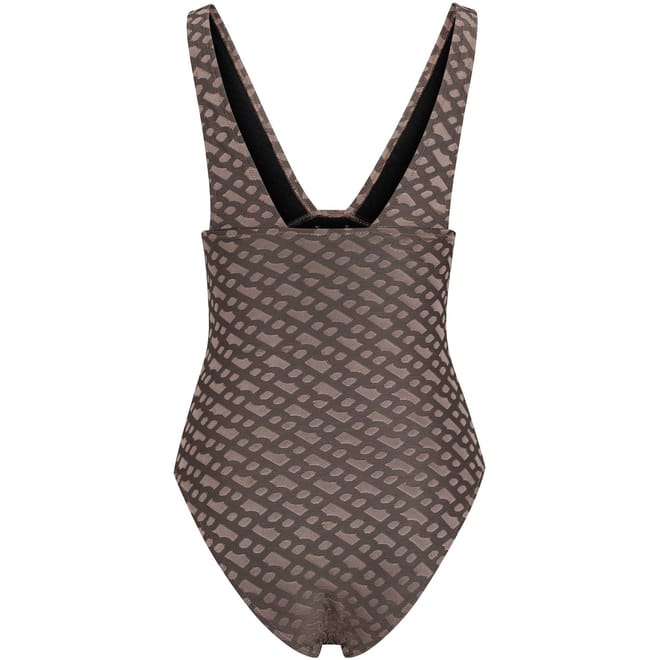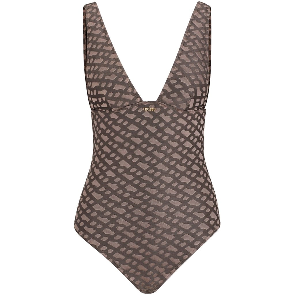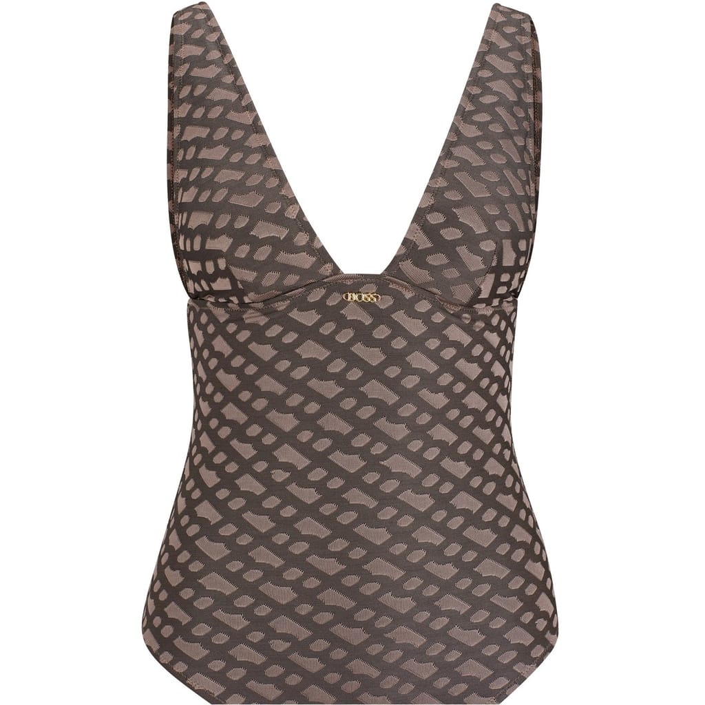 Discover the Boss one-piece swimwear, featuring a striking geometric pattern. This swimwear is elegantly designed with a subtle logo embellishment, offering a stylish and modern look for your beach or poolside outings. -