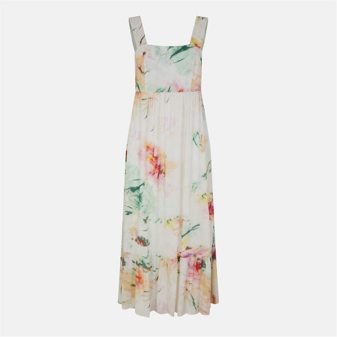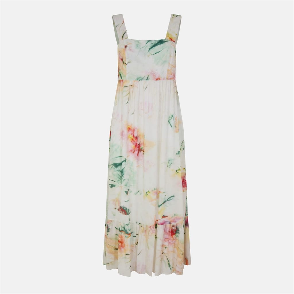 This Boss maxi dress features a square neckline and a spaghetti strap design, offering a chic and elegant look. The floral pattern adds a touch of femininity, while the ruffle hem enhances its A-line silhouette. Perfect for making a statement, this dress combines style and sophistication effortlessly. -