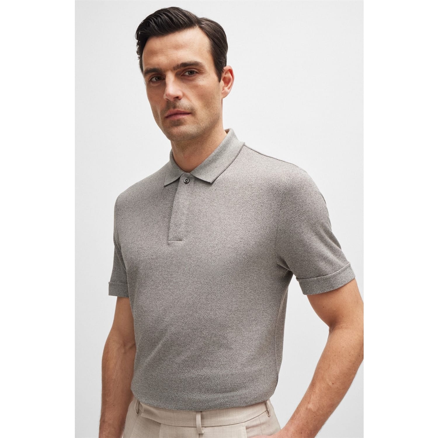 This Boss top from the semi-formal collection features a solid pattern and a polo collar. Designed with short sleeves and a regular fit, it includes a button closure. The top is elegantly finished with a logo embellishment, making it a versatile addition to your wardrobe. -