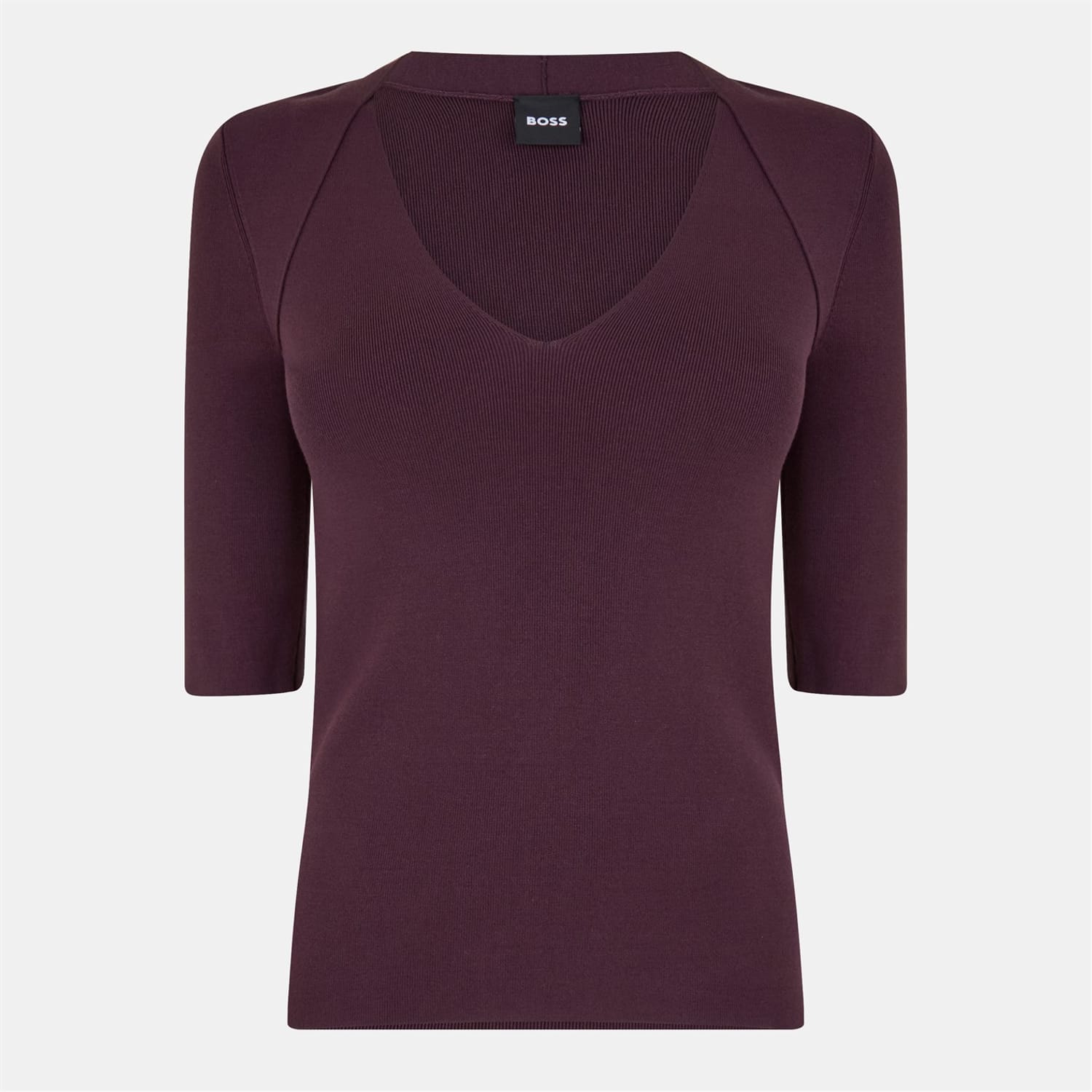 This Boss bodycon dress features a ribbed pattern and a flattering V-neck. Designed with a slim fit, it offers a sophisticated silhouette. The three-quarter sleeves add a touch of elegance, making it a versatile choice for various occasions. -