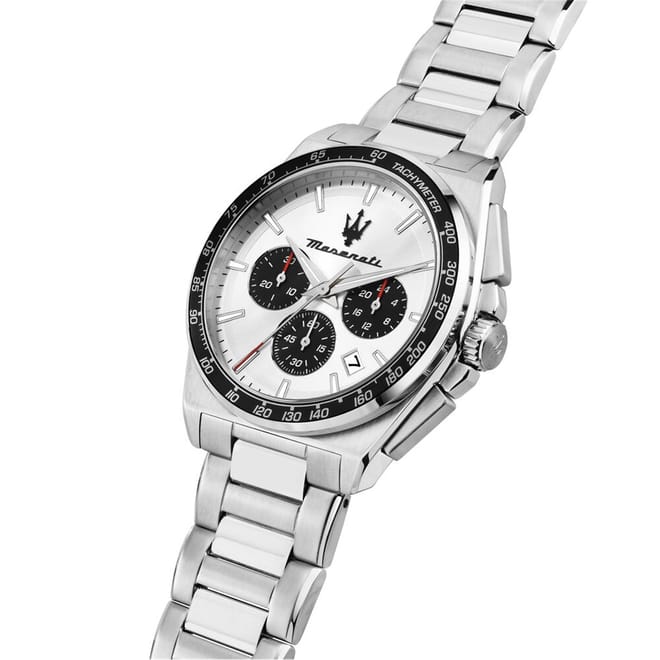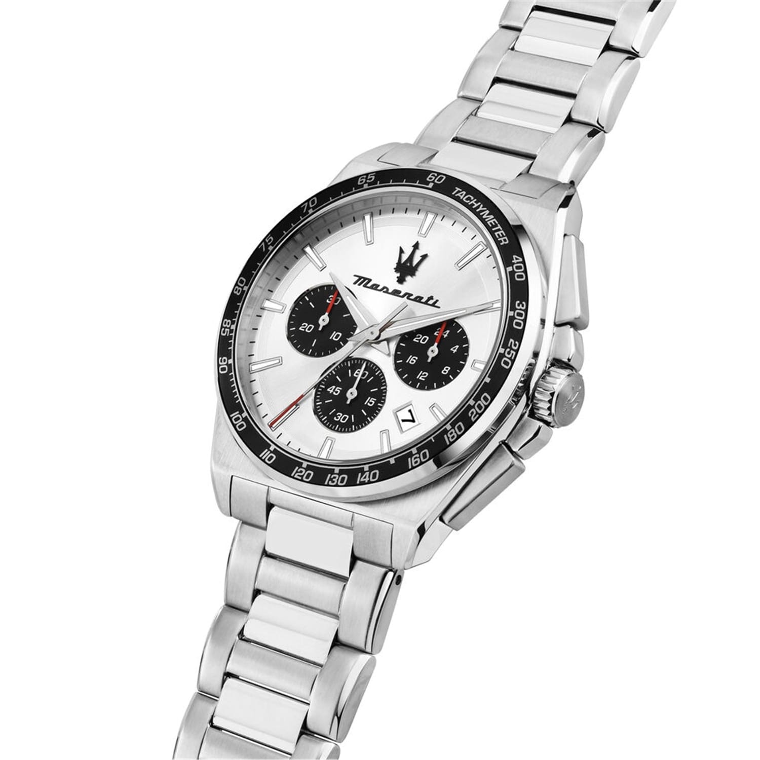 Discover the elegance of Maserati with this wrist watch, featuring a classic white dial and an analogue display. The steel bracelet strap adds a touch of sophistication, making it a perfect addition to any casual collection. This timepiece embodies the timeless style and precision that Maserati is renowned for. -