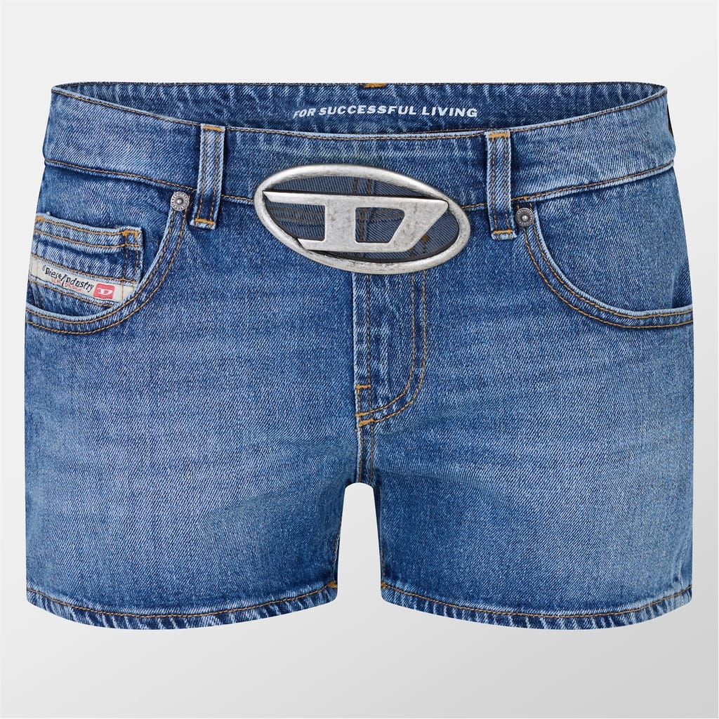 These Diesel jean shorts feature a solid pattern and are designed with belt loops, a zip fly, and a button closure. The shorts are embellished with a logo and pockets, offering a stylish and practical choice for casual wear. -