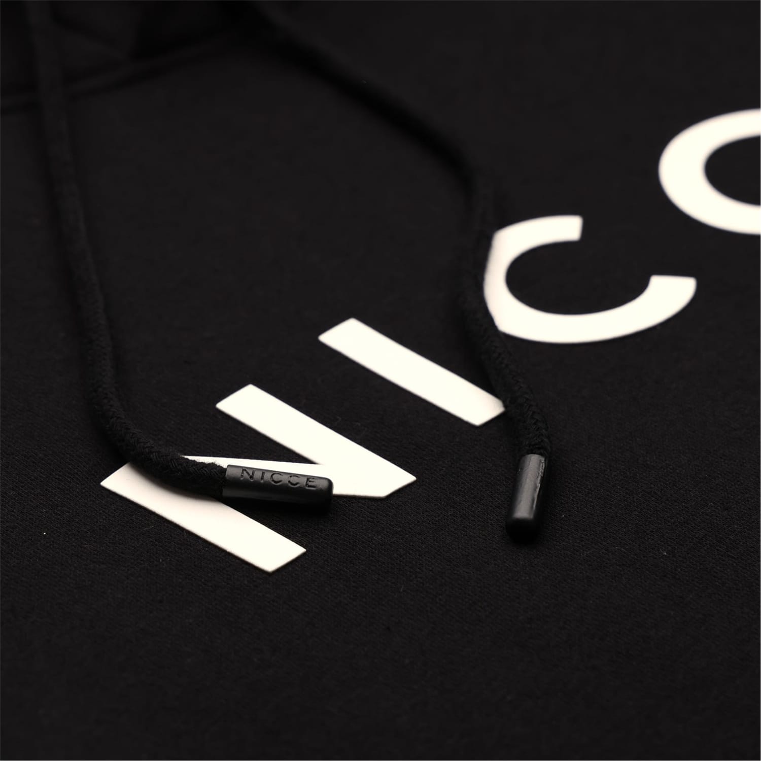 This Nicce top features a hooded neck and long sleeves with ribbed cuffs, offering a regular fit. The drawstring closure adds functionality, while the logo print pattern provides a stylish touch. -