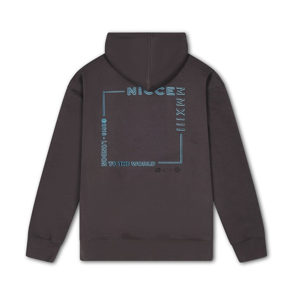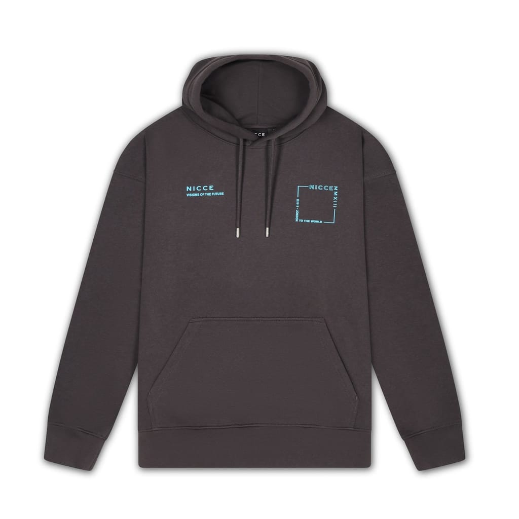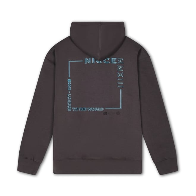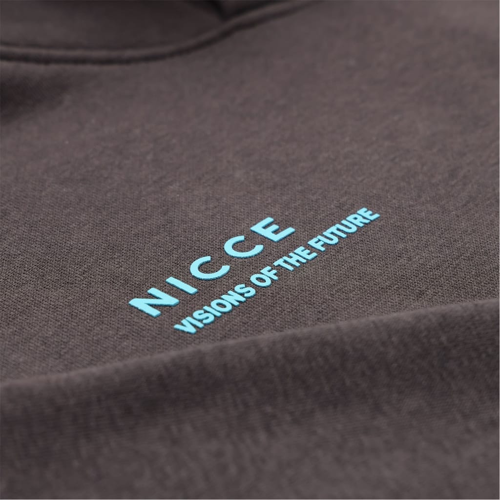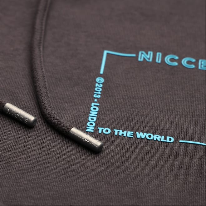 Discover the Nicce top featuring a hooded neck and long sleeves. This regular fit design includes a drawstring for added comfort. The ribbed cuffs enhance the fit, while the kangaroo pocket adds practicality. A printed logo with lettering detail completes the look, making it a stylish choice for casual wear. -