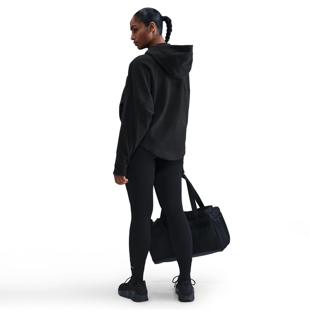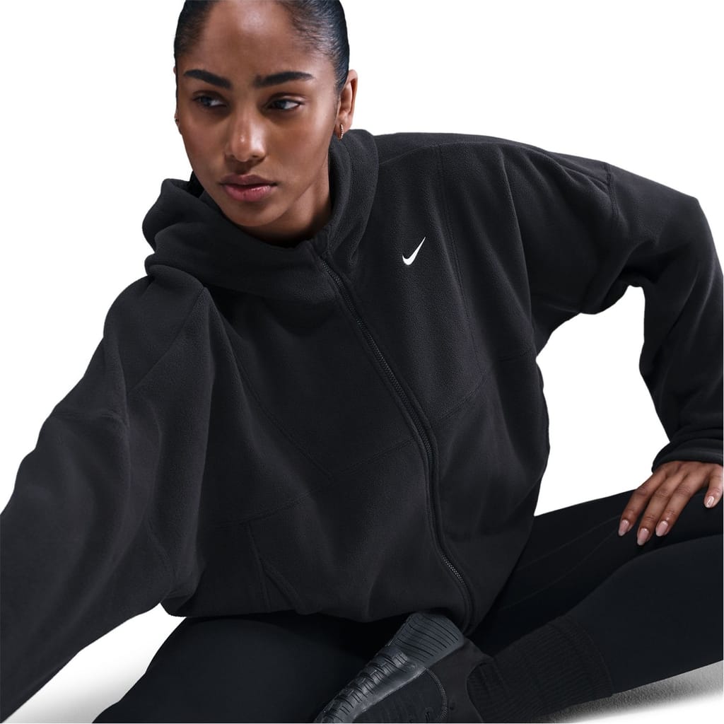 This Nike jacket from the activewear collection features a hooded neckline and a full zipper closure. Designed with a relaxed fit, it has a short length and a curved hem. The solid pattern is complemented by a logo embellishment, while ribbed cuffs add a touch of detail. -
