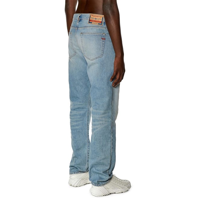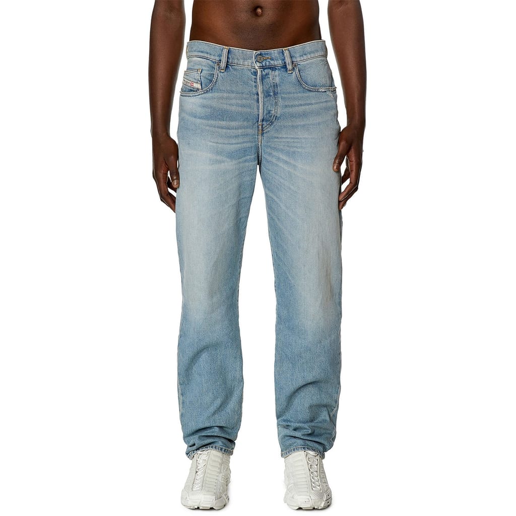 Diesel jeans feature a light wash and a straight fit, offering a classic five-pocket design. The jeans are equipped with a zip fly, front button, and belt loops for secure wear. Embellished with detailed stitching, they include front, back, and coin pockets, along with a distinctive waist patch, ensuring both style and functionality. -
