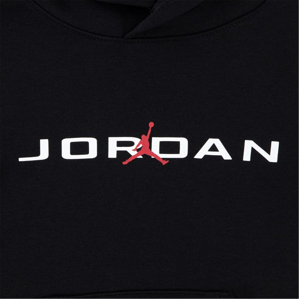 The Air Jordan Baseline full track suit features a hooded neck sweatshirt with long plain sleeves, designed in a classic hoodie style. The set includes casual sweatpants, both adorned with a distinctive logo print. This ensemble combines athletic and casual elements, offering a stylish and comfortable option for various occasions. -