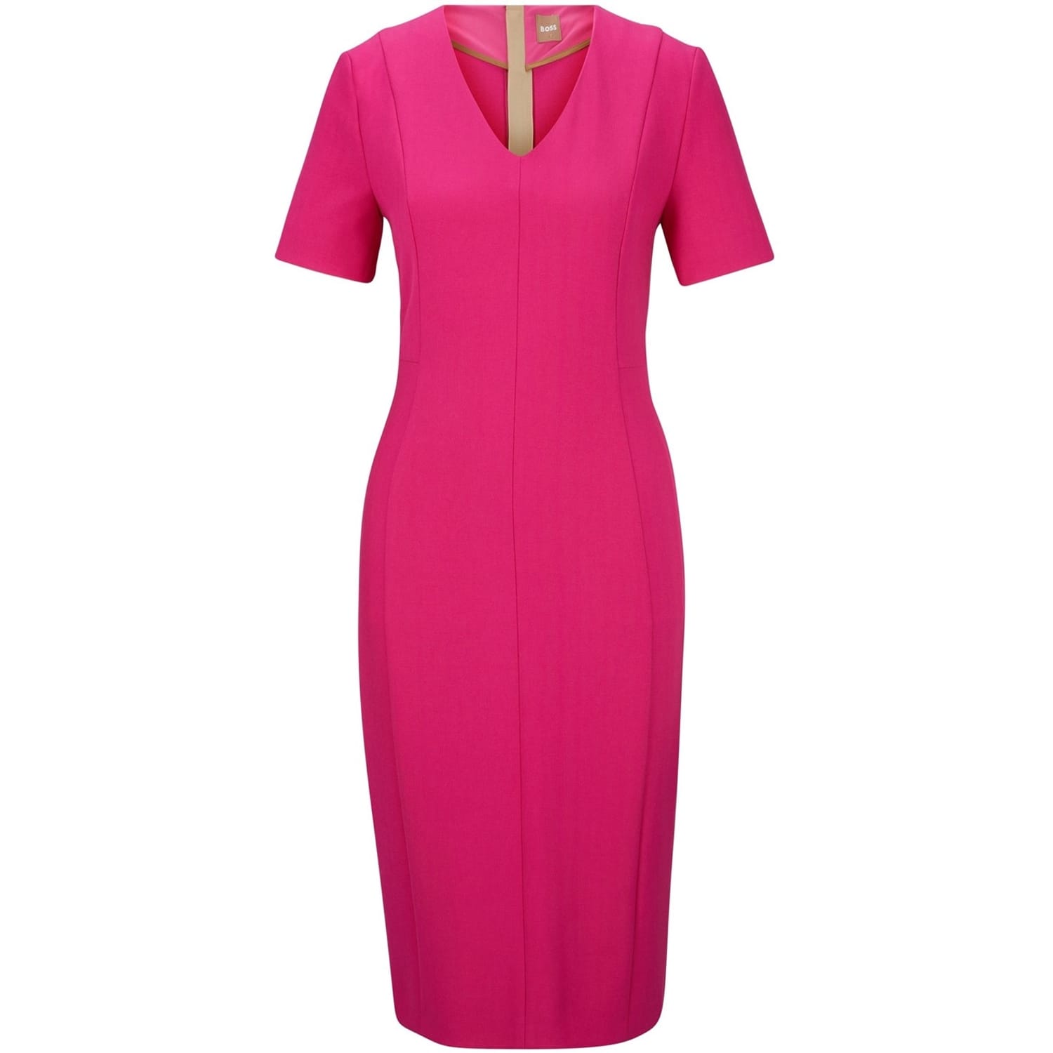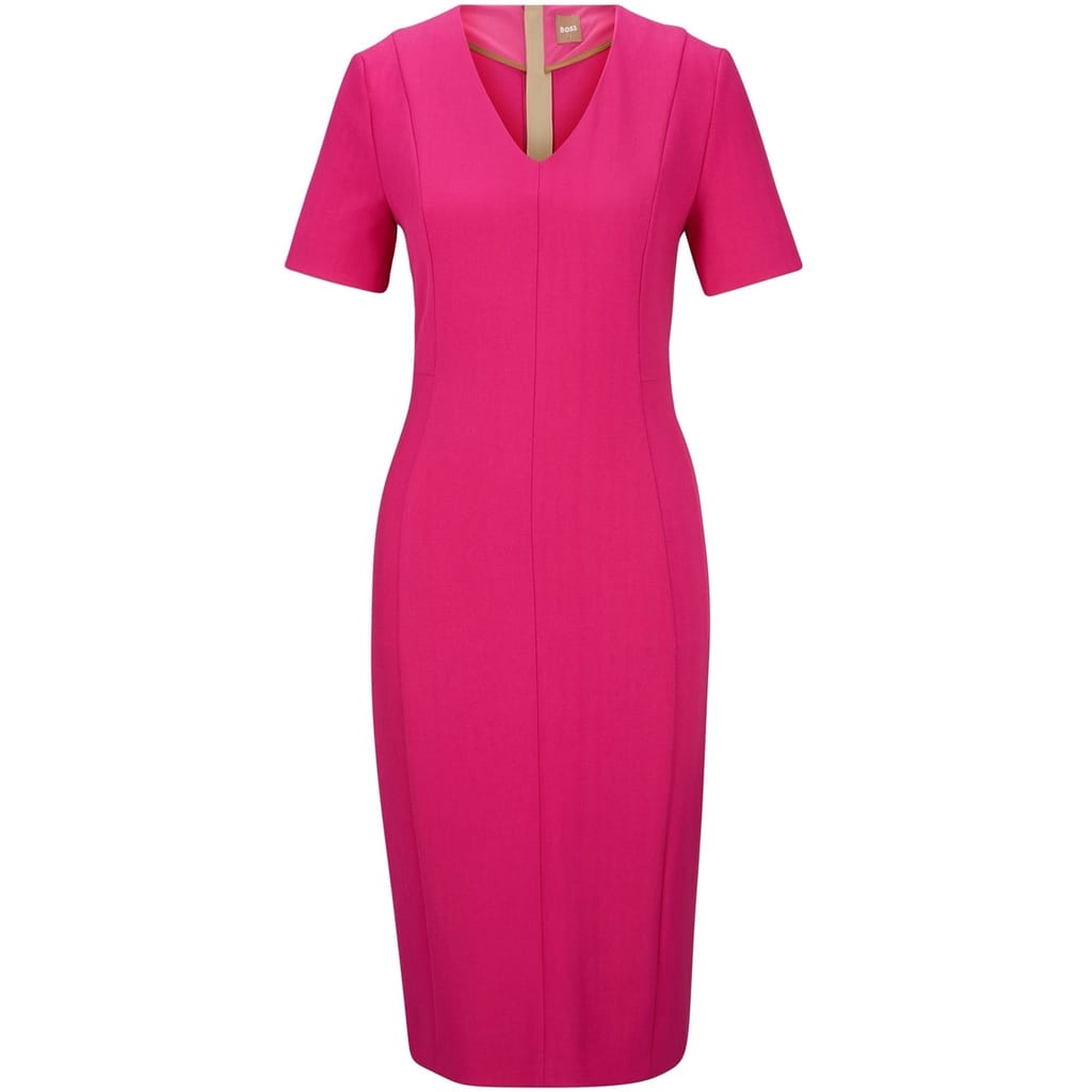 This Boss midi wrap dress features a v-neck and a straight hem, offering a sleek and sophisticated look. The solid pattern and slim fit enhance its elegant appeal, making it a versatile addition to any wardrobe. -