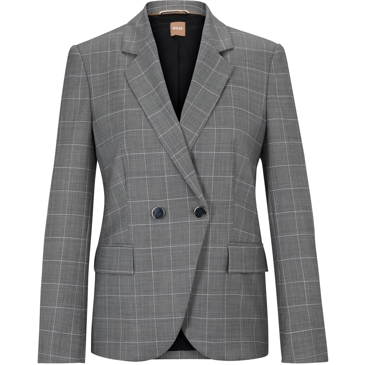 This Boss suit jacket features a classic plaid pattern and a lapel collar, offering a sophisticated touch. The regular fit ensures comfort, while the double-button closure adds a refined element. With a straight hem and practical pockets, this short jacket is a versatile addition to any wardrobe. -
